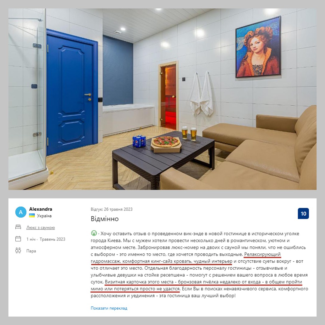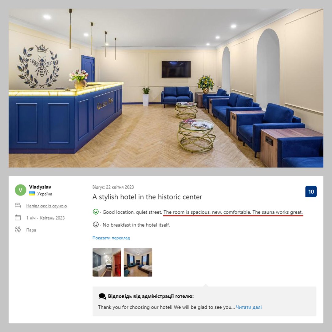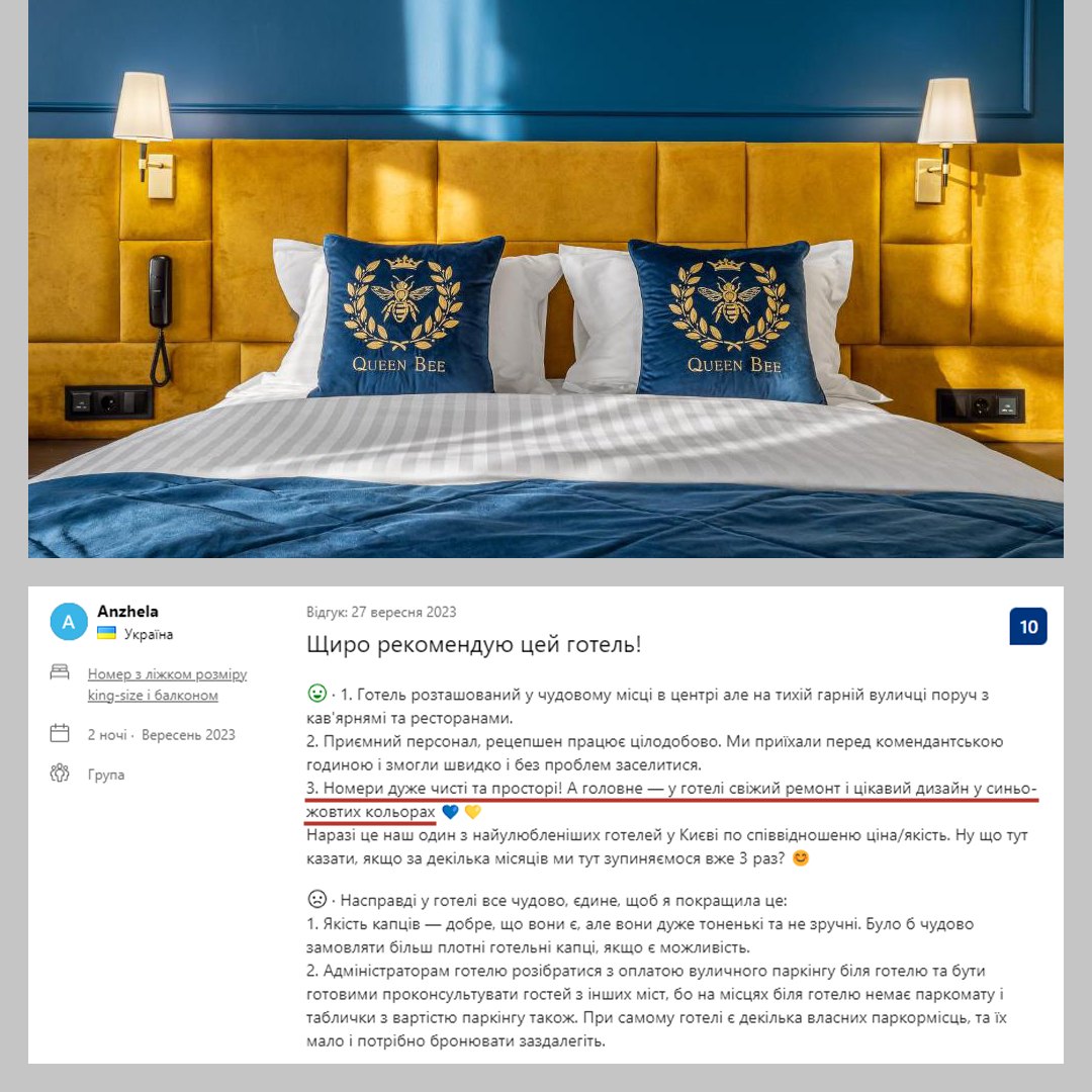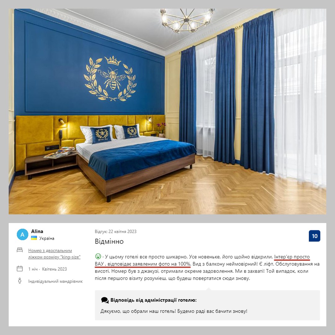 Можно бесконечно рассказывать о своих навыках и опыте в дизайне и проектировании гостиниц, но истинную независимую оценку дает рейтинг на системе бронирования. Гости киевского отеля Queen Bee выразили свое мнение, присудив ему великолепную оценку - 9,7 из 10. Это, безусловно, впечатляет. Конечно, важна организация обслуживания, но давайте обратим внимание на отзывы. Они описывают стильный, роскошный и атмосферный интерьер, который создает комфорт. Оценки типа "джакузи - топ" говорят о качестве работы нашей команды дизайнеров. Мы заботились о деталях, начиная от удобных розеток и заканчивая наличием джакузи в номерах.