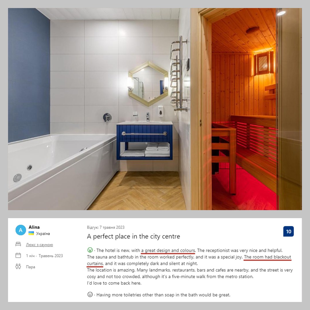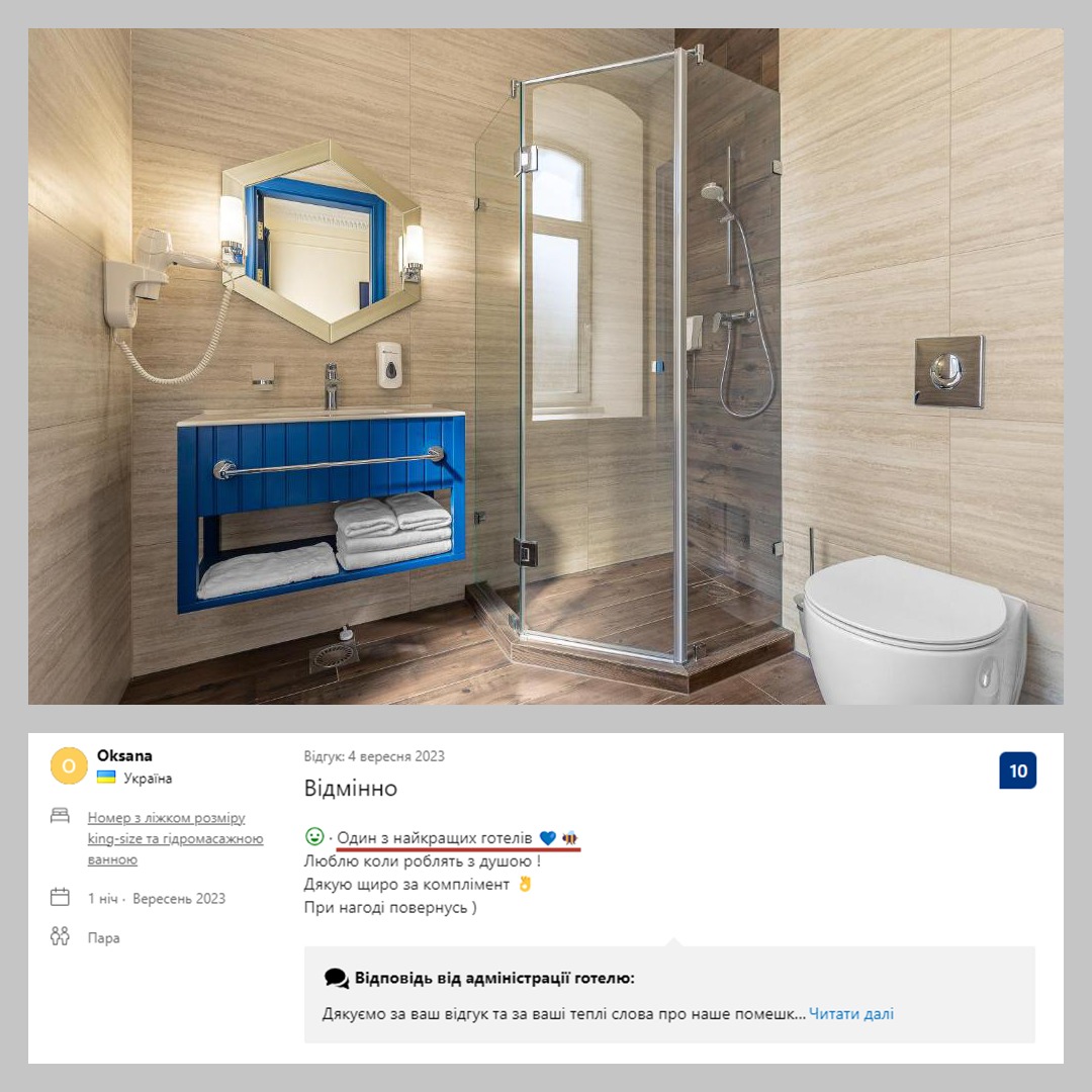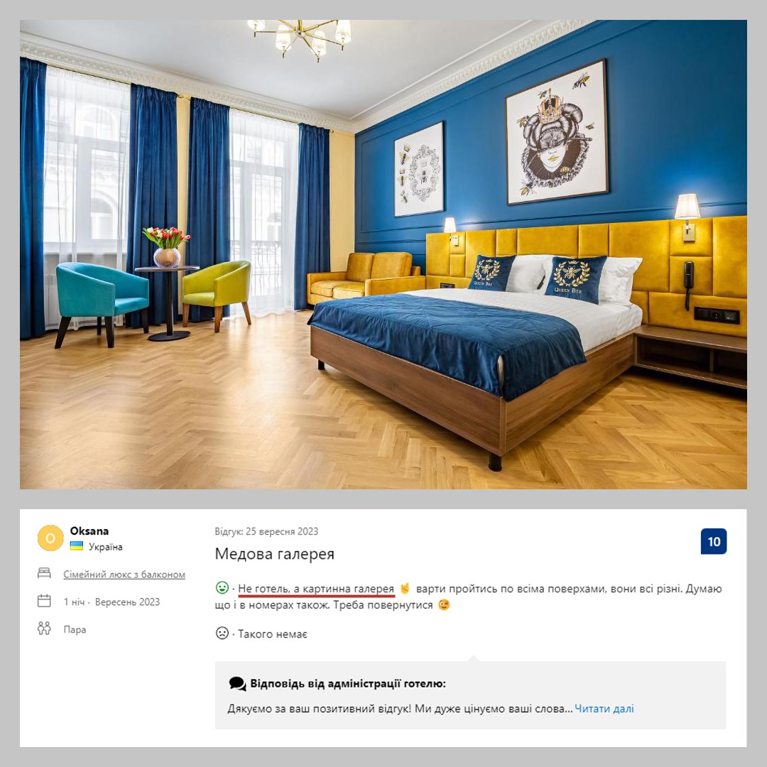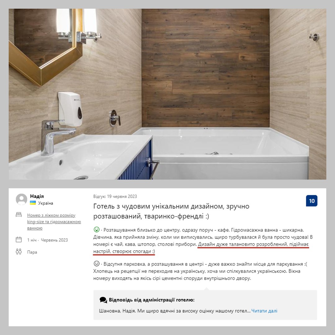 Можно бесконечно рассказывать о своих навыках и опыте в дизайне и проектировании гостиниц, но истинную независимую оценку дает рейтинг на системе бронирования. Гости киевского отеля Queen Bee выразили свое мнение, присудив ему великолепную оценку - 9,7 из 10. Это, безусловно, впечатляет. Конечно, важна организация обслуживания, но давайте обратим внимание на отзывы. Они описывают стильный, роскошный и атмосферный интерьер, который создает комфорт. Оценки типа "джакузи - топ" говорят о качестве работы нашей команды дизайнеров. Мы заботились о деталях, начиная от удобных розеток и заканчивая наличием джакузи в номерах.