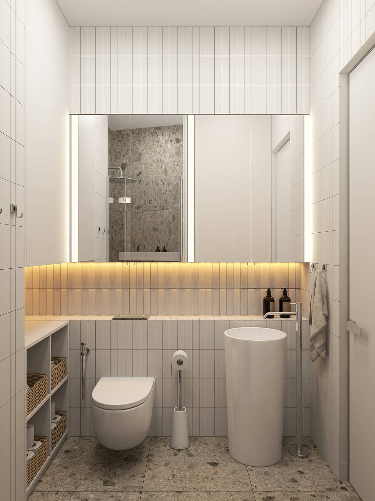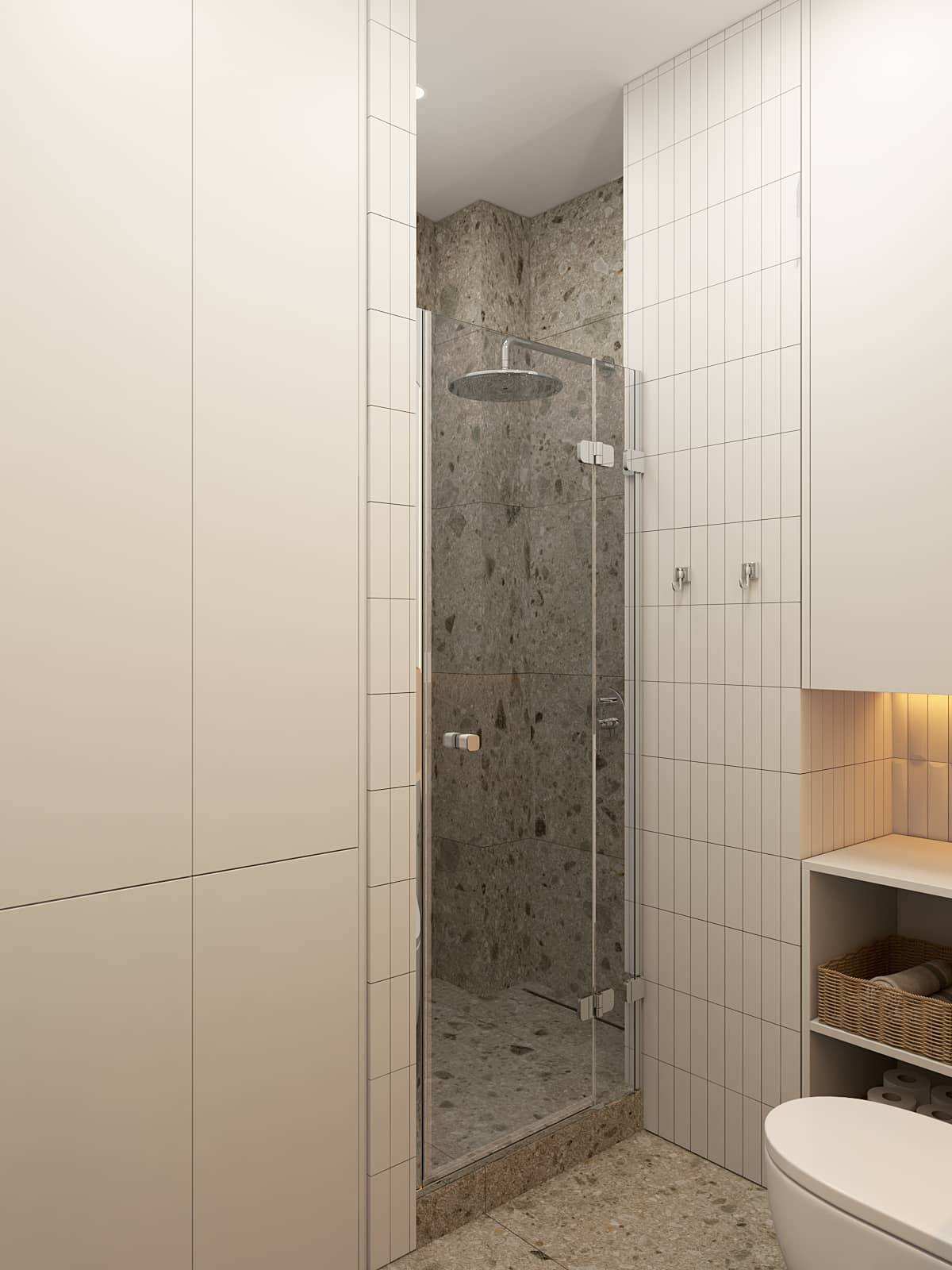 Нужно отметить, что планировки квартир в резиденции Кандинский очень специфические. Архитектурные формы здания различаются на различных уровнях, создавая уникальные и иногда удивительные пространства — стены пересекаются под всевозможными углами, отличными от 90 градусов, что сильно усложняет как планировку, так и меблировку. Работать с неудачными планировками от застройщика — задача, которая требует профессионализма и концентрации сил, и наша команда, по итогу, прекрасно справилась с задачей. Мы создали планировочное решение апартаментов, которое можно назвать крайне удачным — острые углы не создают неудобств и видимого эстетического несовершенства, при этом потери полезной площади минимальны.