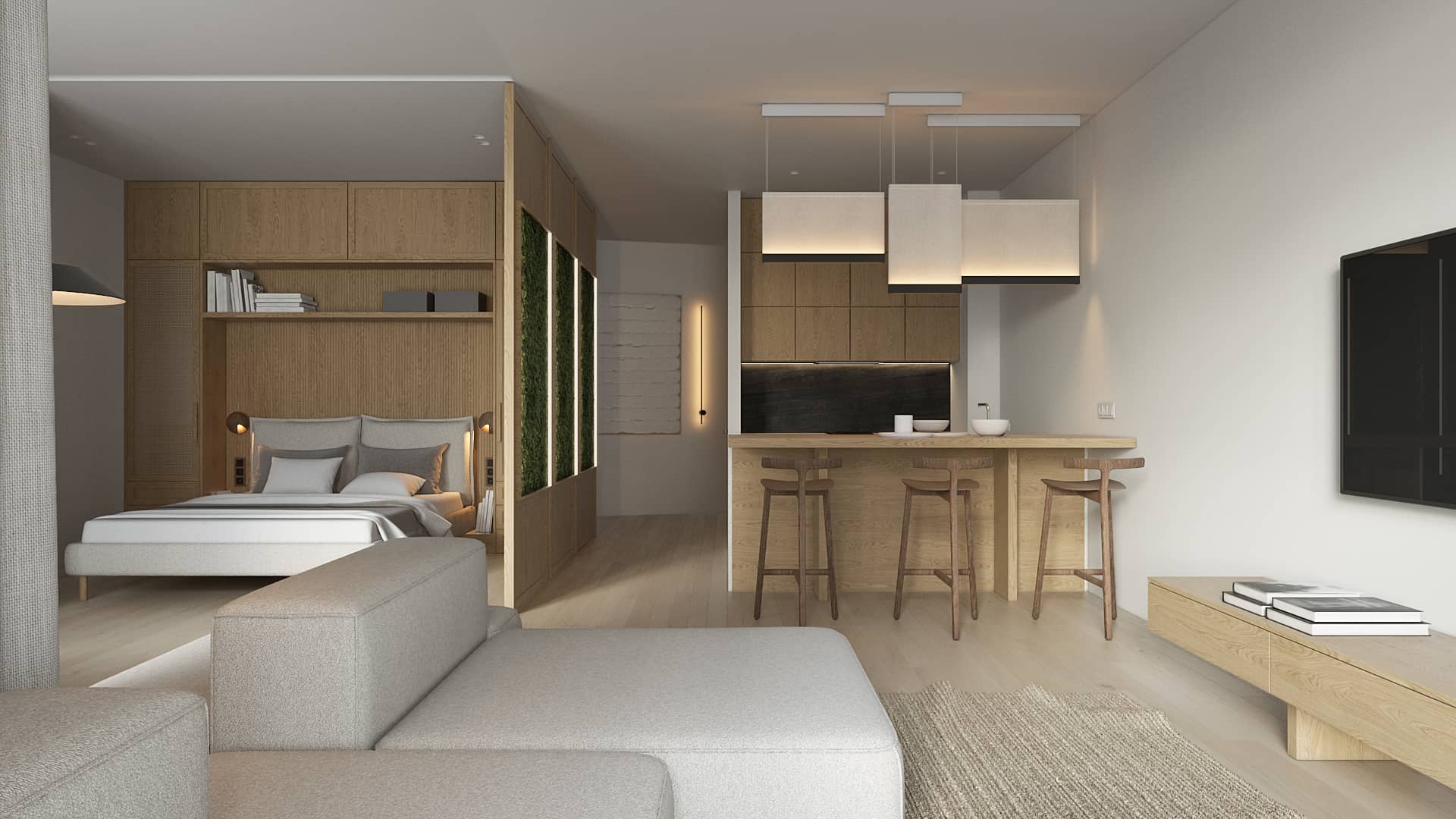 Особое внимание мы уделили функциональности планировочного решения этих апартаментов. В планировке квартиры есть все, что необходимо для комфортного длительного проживания — много мест для хранения, полная комплектация необходимой бытовой техникой, в том числе стирально-сушильная и посудомоечные машины. Особенность планировки — минимизация межкомнатных стен и перегородок — они практически отсутствуют (кроме санузла), а, значит — уменьшение затрат на их возведение и отделку. Зона спальни отделена от коридора шкафом, который и является стеной, а от зоны кухни студии — стеной из мебельных панелей, декорированных стабилизированным мхом. Планировка предусматривает остров, в котором комбинируются функции кухни и стола. со стороны студии зона спальни может закрываться плотной портьерой из ткани dim out.