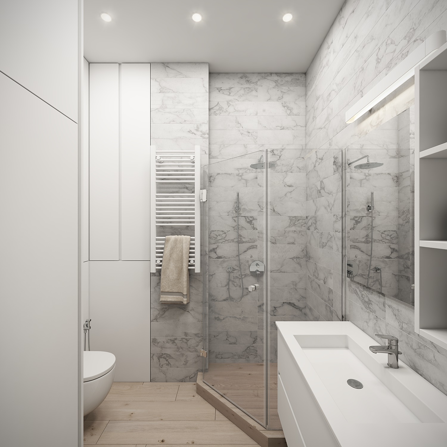 Сам санузел также отличается простым и лаконичным, однако, не менее функциональным дизайном. Несмотря на небольшую площадь помещения, благодаря светлым нейтральным оттенкам и прозрачной душевой кабине, нет ощущения перегруженности интерьера. В небольшие, но вместительные шкафчики поместится все необходимое, а в угловом шкафу «спрячется» стиральная машинка. Изюминкой интерьера является плитка под бело-серый мрамор Calacatta, придающая комнате изысканности.