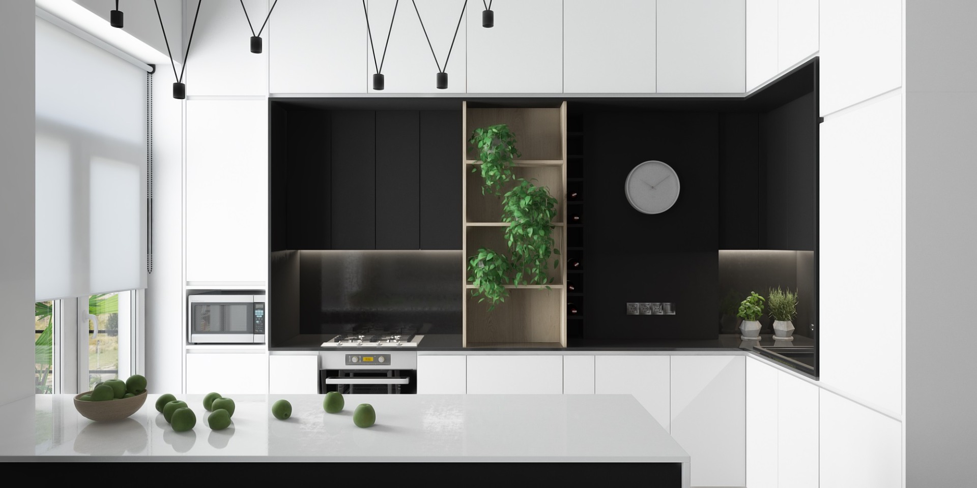 В качестве дополнительного пространства для хранения кухонной (и не только) утвари предусмотрены ящики под потолком. В одном из них «спрячется» бойлер, а остальные послужат очень полезным местом для хранения вещей, которыми хозяева пользуются не так часто. Благодаря облицовке панелями ДСП, отсутствуют щели и неидеальные стыки между мебелью и стенами, крупной бытовой техникой: кухня смотрится целостно, гармонично и как бы продолжается до входной двери.
