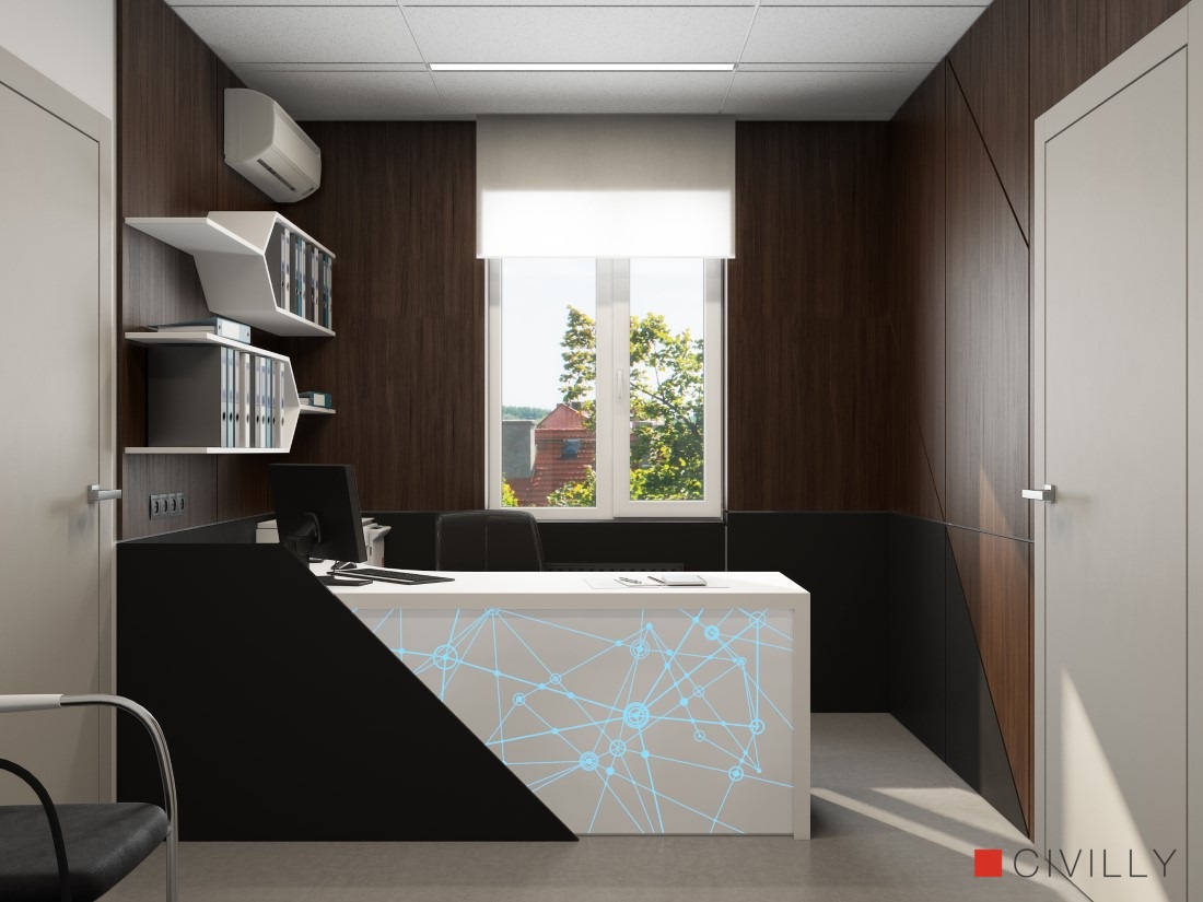 В оформлении дизайна-проекта архитекторы компании Civilly использовали четкие формы, простую геометрию, мягкое рассеянное освещение. В связи с тем, что помещения небольшие, особое внимание при разработке дизайн-проекте офиса пришлось уделить эргономике. Дизайнерам была поставлена задача вместить многие необходимые предметы в очень компактное пространство. Архитекторы нашей компании постарались сделать дизайн офиса простым и комфортным для работы. Офис состоит из группы помещений: приемная, рабочий кабинет руководителя, конференц-зал и комната отдыха.