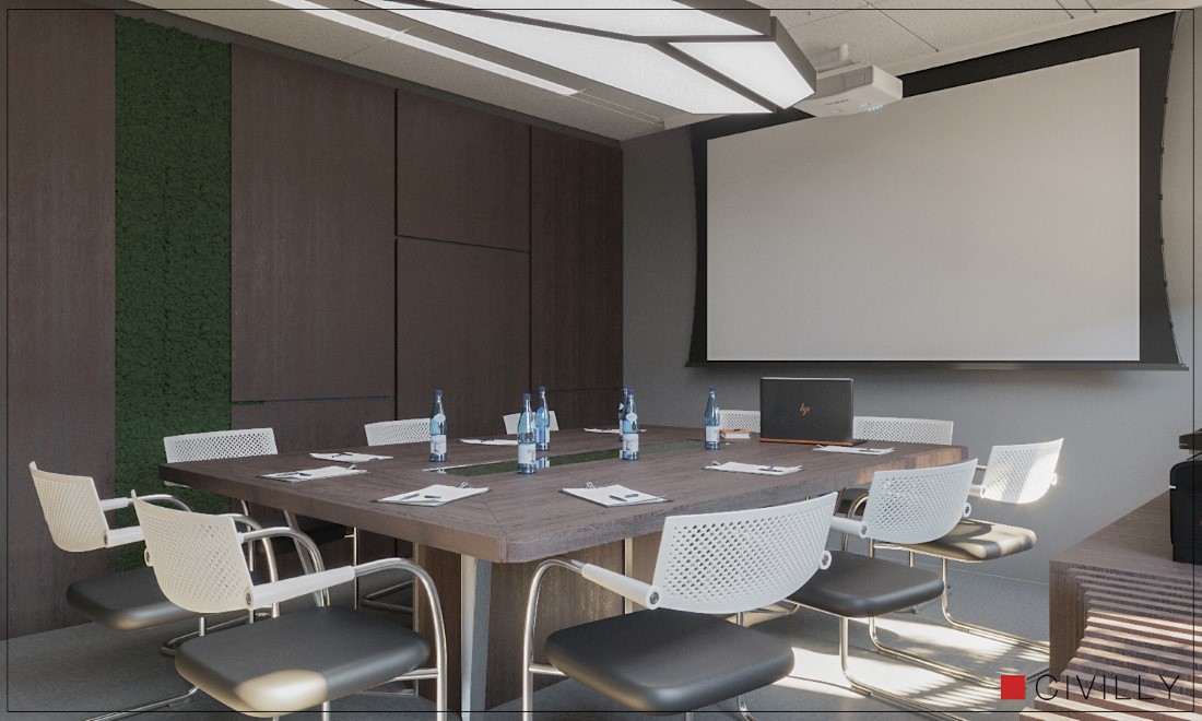 В конференц-зале применены авторские декоративные решетки, которыми закрыты радиаторы, конференц-стол сделан максимально большим, пропорционально размерам помещения. Декоративный стабилизированный мох на стеновых панелях и в центре стола предназначен для того, чтобы несколько разрядить временами суровую атмосферу переговоров.