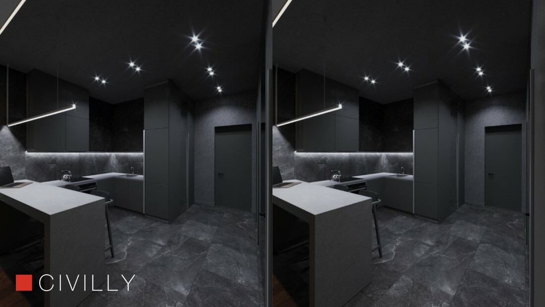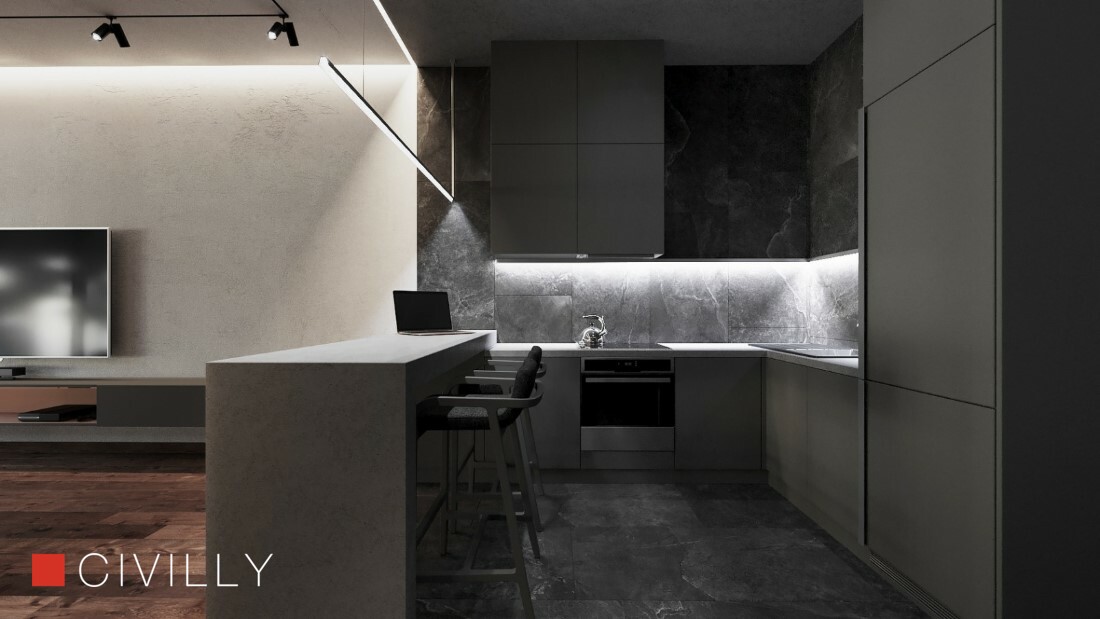 Пространство было визуально зонировано по природным структурам.Входная группа мебели имитирует каменные элементы, и как продолжение, кухня и санузел выполнены в одной цветовой гамме.