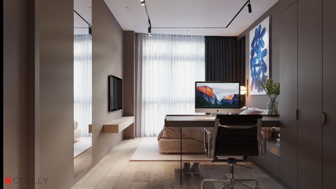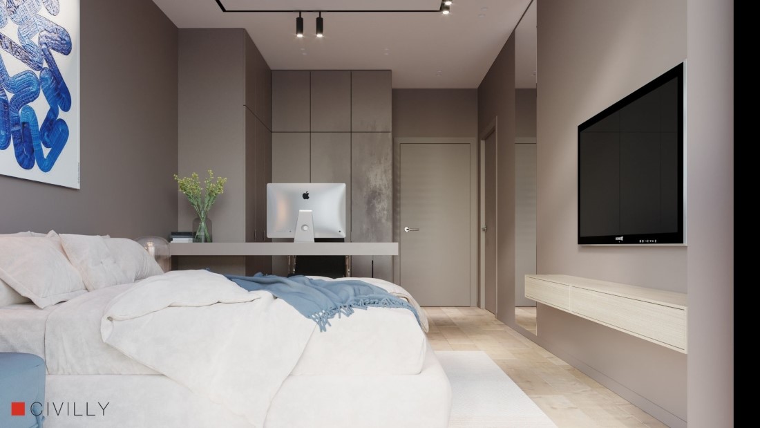 Мастер-спальня. Она продолжает всю концепцию квартиры: теплая, приглушенная и «мягкая» по ощущениям. Одной из задач, которые стояли перед дизайнером интерьера, была необходимость найти комфортное рабочее место для заказчика. В ходе обсуждения, идеальным местом для этого определили спальню, так как в дневное время она является помещением, где можно уединиться и спокойно работать, для этих целей в этой комнате достаточно места. В этом проекте дизайнер специально отказался от отдельной гардеробной – она может «украсть» место, вместо нее вдоль стен размещены большие шкафы, которые вместят все необходимое. Яркие акценты в спальне —картина над кроватью и пуф для туалетного столика. Ножка рабочего стола выполнена из стекла и слегка затемнена, создается ощущение, что стол парит в воздухе.