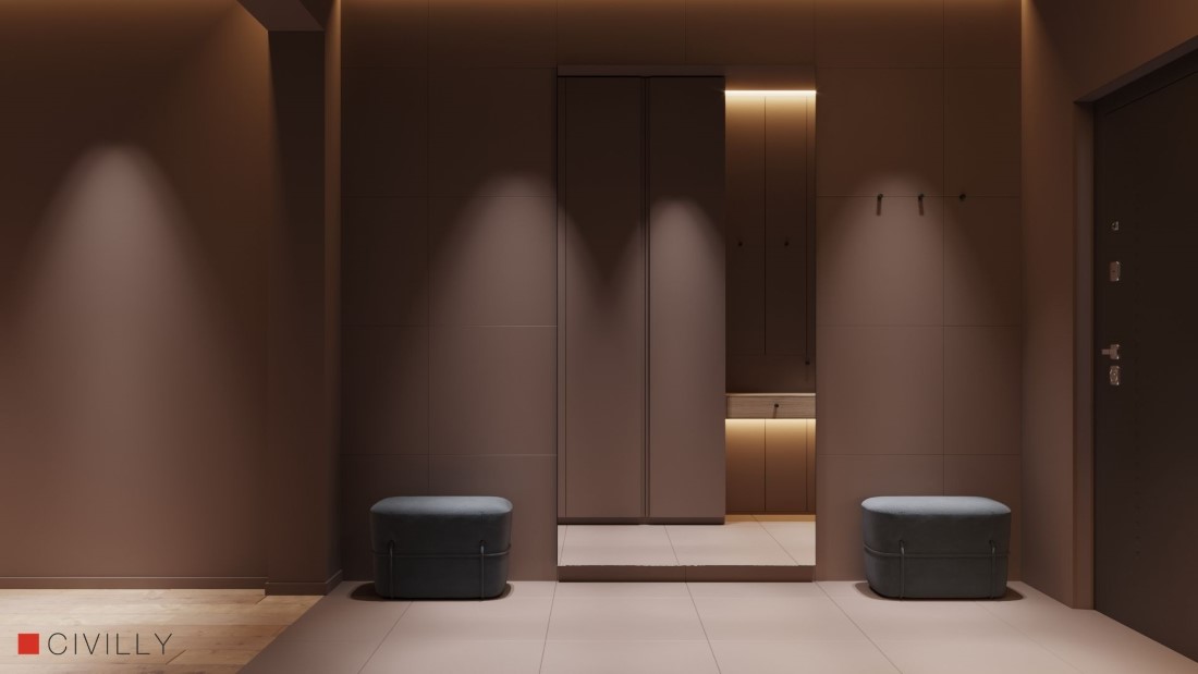 Коридор – место, куда прежде всего попадаешь, войдя в квартиру. В нем также много мест для хранения, но при этом это не создает ощущение скованности пространства. Все это благодаря тому, что шкаф выполнен от пола до потолка и выдержан в одном цвете. С противоположенной стороны (при входе справа) есть большое зеркало и 2 пуфа – они являются цветовыми акцентами и добавят удобства в процессе одевания.