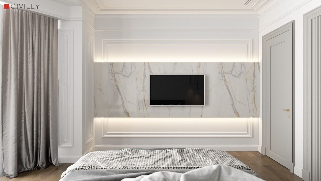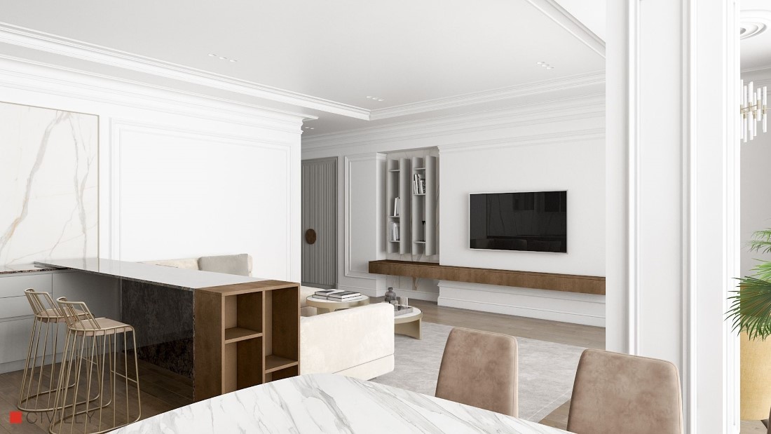 Начнем мы, пожалуй, с гостиной. Это место где хозяева принимают гостей. Все выполнено в светлых тонах, как и диктует нам выбранная концепция, стены и потолок украшены гипсовыми молдингами и карнизами, но не слишком вычурно, без перебора. В интерьере нет слишком ярких цветовых акцентов, вместо них мы видим – глубокие горчичные и коричневые цвета. Здесь удобно разместиться как за обеденным столом, так и на диване, достаточно места для приема гостей. Стены на кухне отделаны широкоформатной плиткой, имитирующей белый мрамор, они продолжаются и со стороны обеденного стола. Днем в этой зоне много света, а вечером можно наблюдать за огнями города. Такую возможность нам дают панорамные окна. Зона отдыха и стена за телевизором не нагружены элементами декора. Архитектор оставил там лишь консольную тумбу и полки в стене: для книг или важных мелочей.