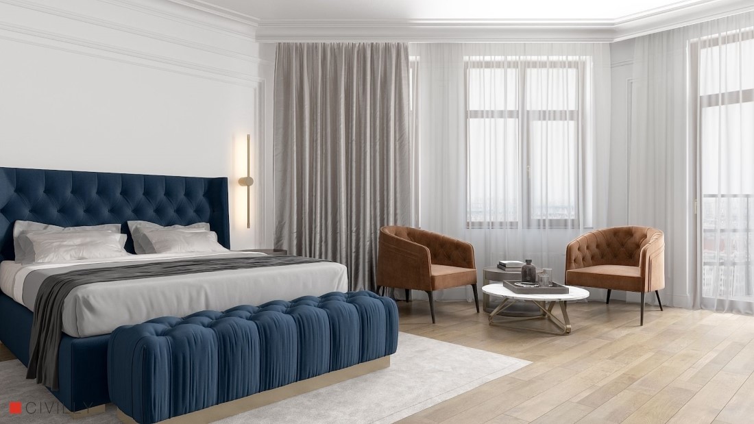 Мастер-спальня – личное пространство хозяев. Эта комната расположена в той части квартиры где нет панорамных окон, таким образом создается ощущение большего уюта и уединенности. Дизайн интерьера учитывает пожелания заказчика и в спальне выделено место для отдыха - кресла и столик – за здесь можно пить утренний кофе или расположиться для вечернего уютного чтения книг. Потому как спальня является местом только отдыха, дизайнер убрал люстры и оставил только бра над кроватью, точечный свет и подсветку туалетного столика. Здесь добавили акцент на глубокий синий цвет - он прослеживается в изголовье кровати, пуфе и банкетке. Главной идеей было создать уют и тепло.