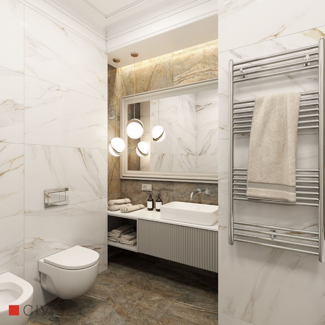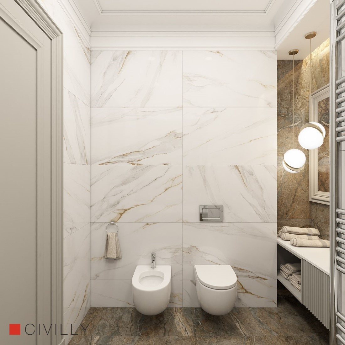 Предусмотрительные заказчики попросили наших дизайнеров разделить ванные комнаты. Есть мастер-санузел и ванная для гостей. Хозяйская ванная комната богато облицована плиткой с рисунком мрамора. Он здесь двух оттенков для создания контраста. В ней расположена именно ванна, в которой, тем не менее, можно принять душ. Консольную тумбу с раковиной украшают необычные светильники. В мастер-санузле нет ничего лишнего: сушильная и стиральная машины перенесены в гостевую туалетную комнату.