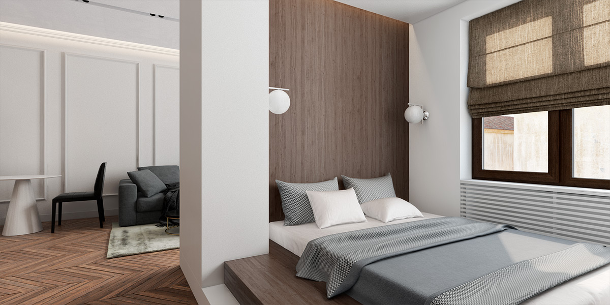 Мы выстроили открытую дневную зону: кухня с островом-полуостровом и обеденной группой перетекает в гостиную с лаконичной ТВ-панелью; приватный блок — спальня с гардеробной нишей и ванная. Базовая палитра — белые матовые поверхности + текстуры натурального дерева, которые добавляют тактильного тепла. На полу — инженерная доска «французская ёлка», визуально расширяющая пространство.