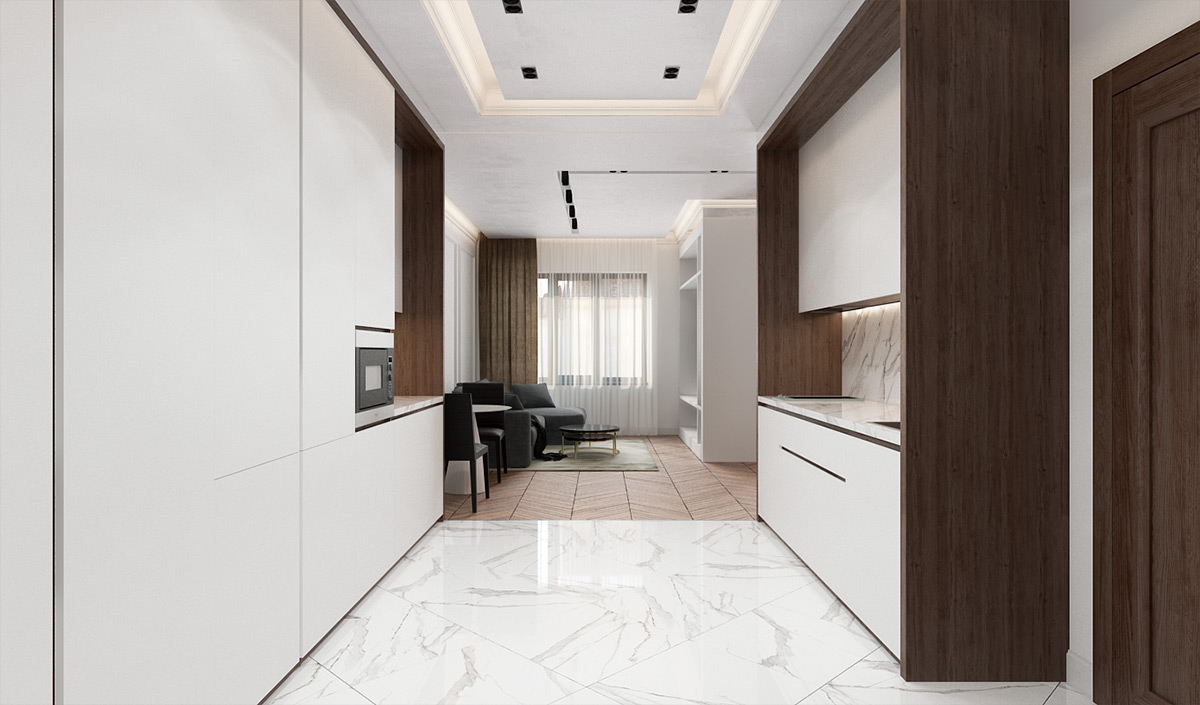 Классика проявлена деликатно: тонкие карнизные линии, молдинги на акцентных плоскостях, симметрия в расстановке светильников; минимализм — в чистой геометрии кухонных фасадов без ручек, скрытых шкафных системах и ровных плоскостях. Освещение — многоуровневое (встраиваемые базовые точки, подвес над столом, линейная подсветка рабочих зон и полок), создающее тёплый, непринуждённый сценарий.