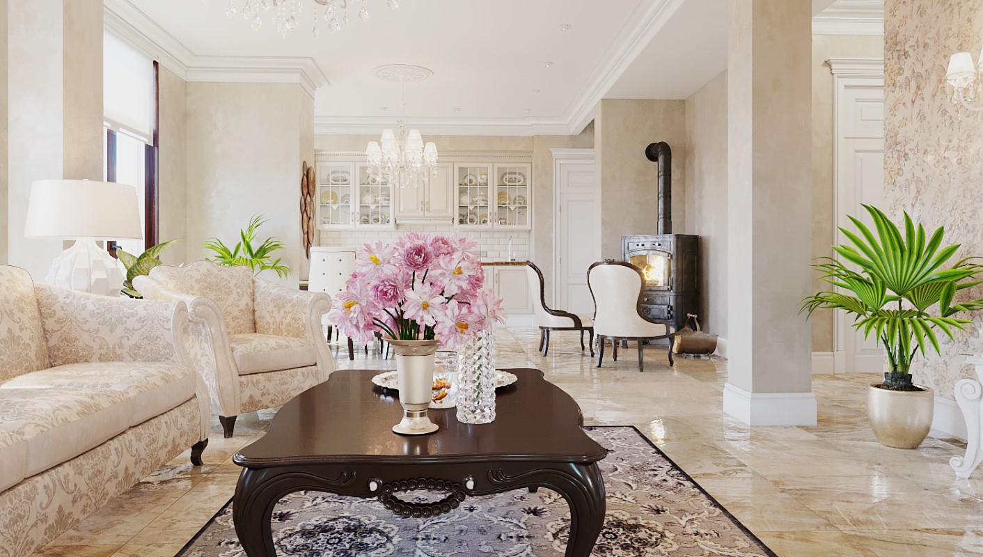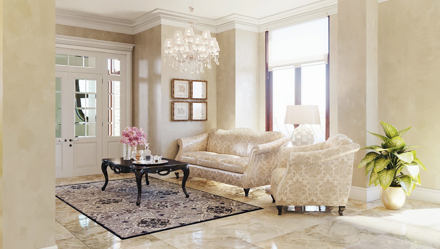 Гостиная - стильная и утонченная. В гармоничной композиции преобладает прямолинейность, симметричность, четкость. Обстановка - строгая и благородная, декор – роскошный, но без вычурности. Неоправданная пышность и вызывающие текстуры здесь отсутствуют. Пастельные, светлые тона в дизайне интерьера визуально увеличивают пространство.