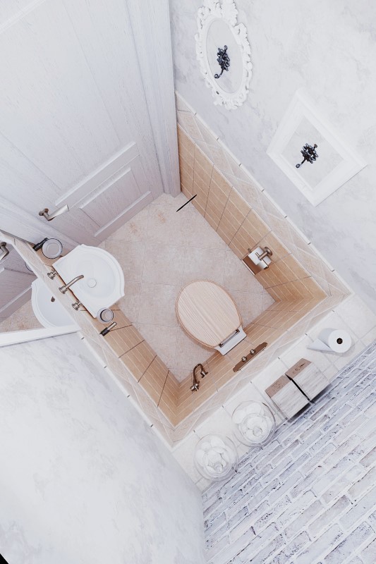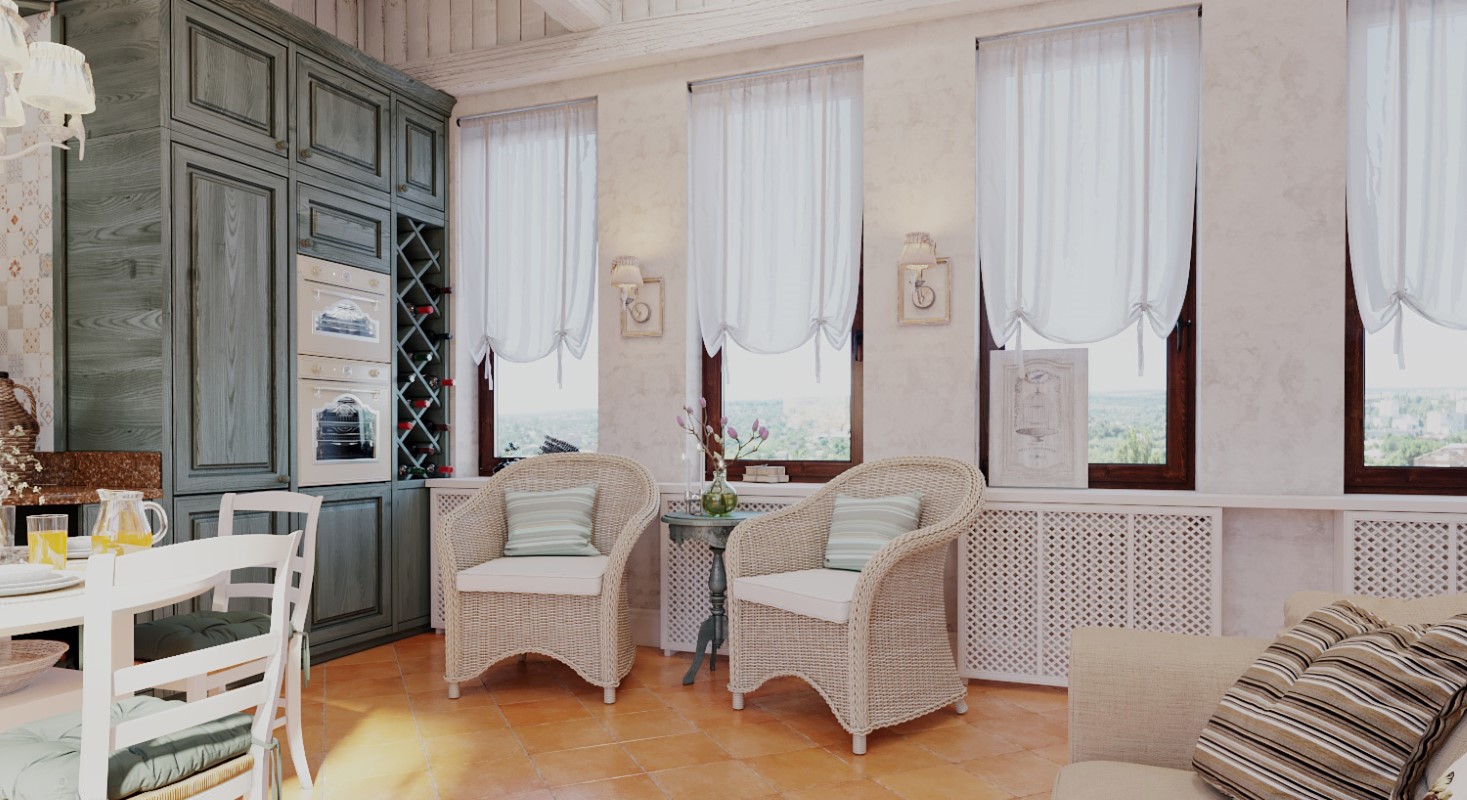 Привлекает внимание потолок, отделанный деревом – интересное решение, которое еще больше подчеркивает стиль «французского кантри».