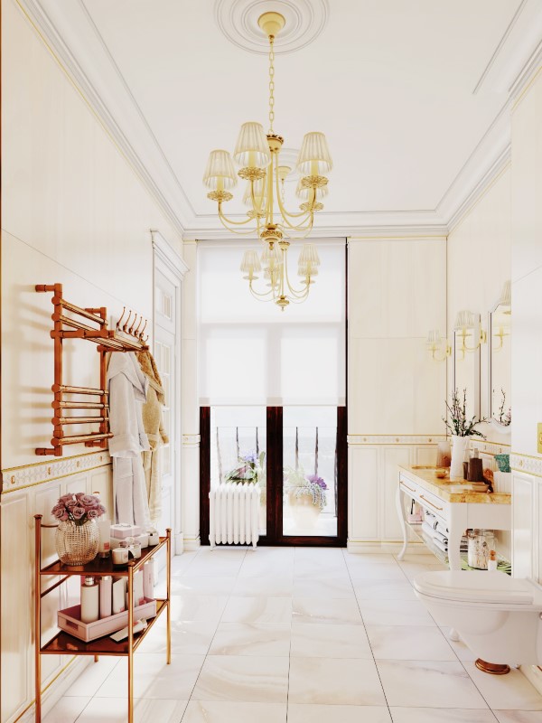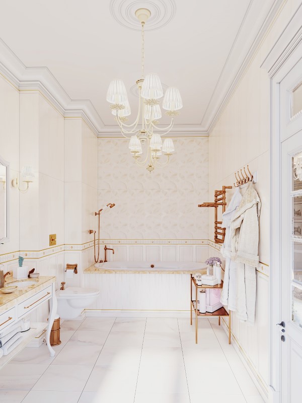 Характерным элементом стиля неоклассики является деревянный паркет. В нашем случае престижным и респектабельным является сочетание натурального дерева и плитки, а широкий плинтус в оригинальном исполнении подчеркивает изысканность этих материалов.