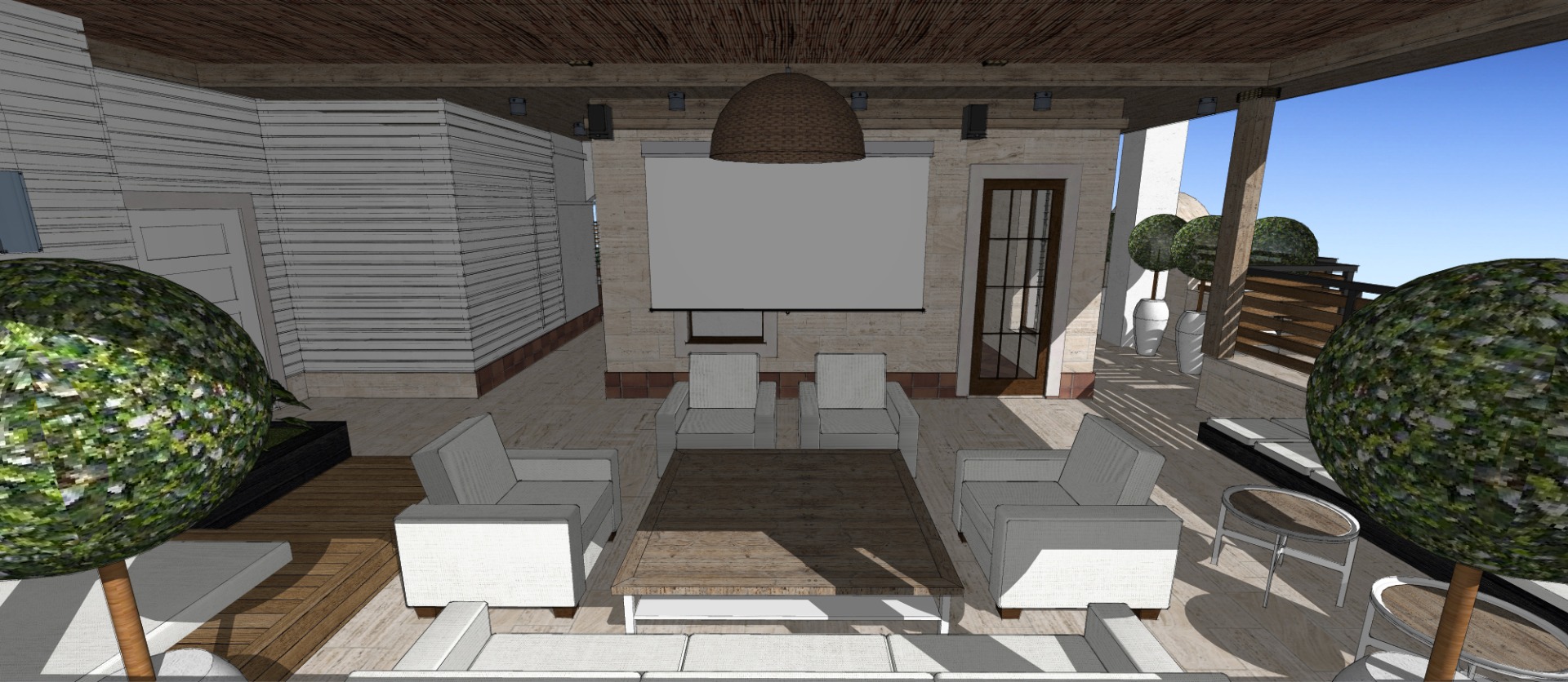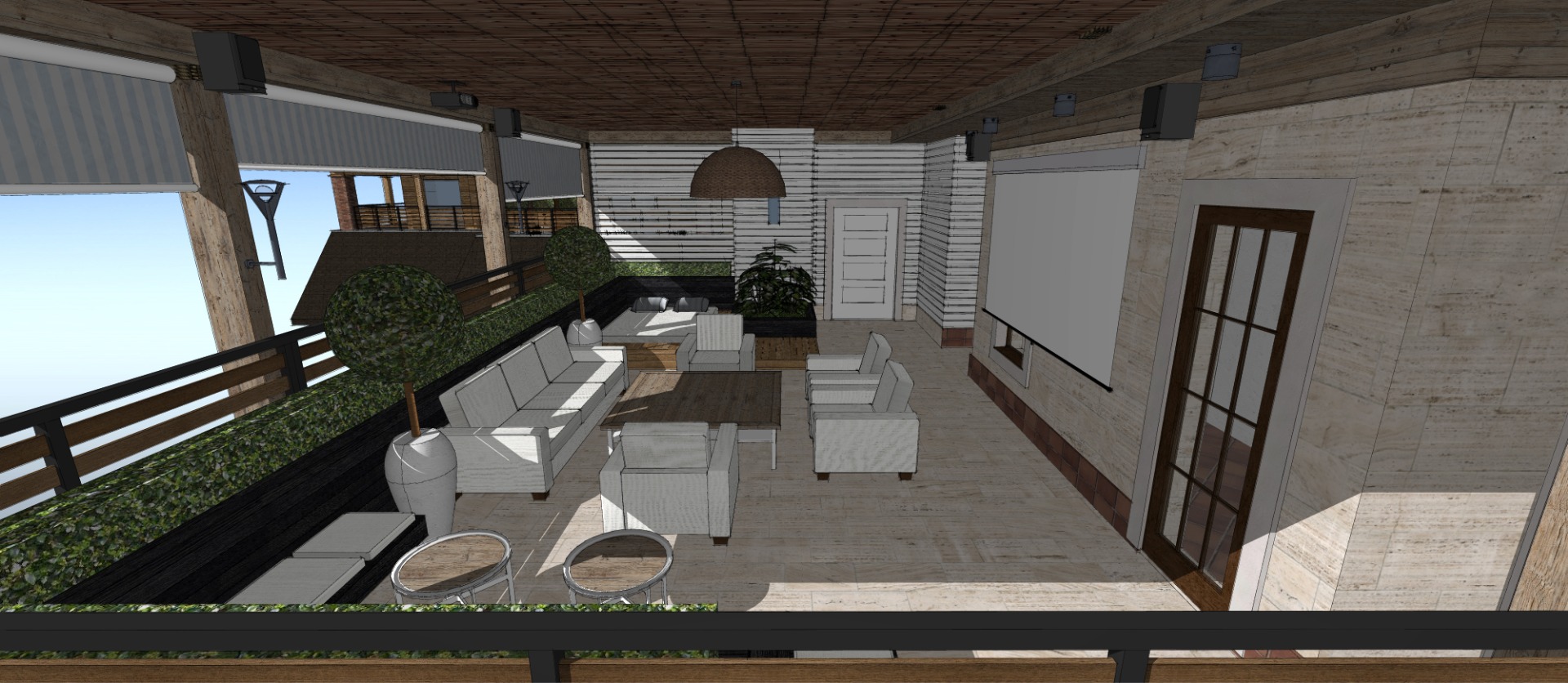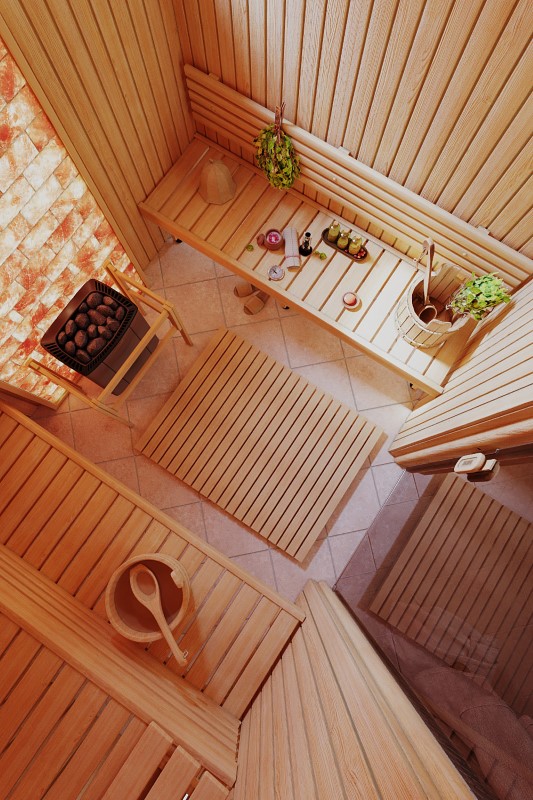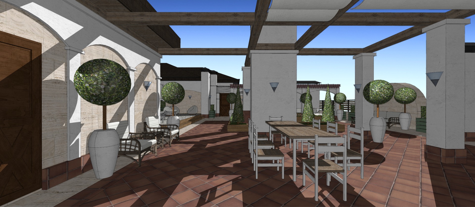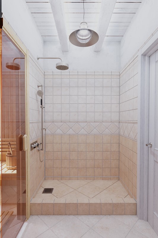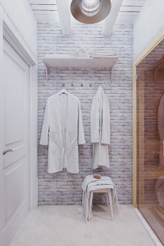 Здесь много естественного освещения, невесомые, полупрозрачные занавески визуально расширяют пространство. Широкие двери ведут на обширную террасу, где можно отдохнуть от рабочей суеты, любуясь видом на город или принять ледяной душ после горячей бани.