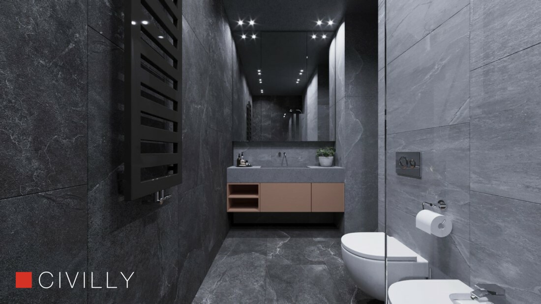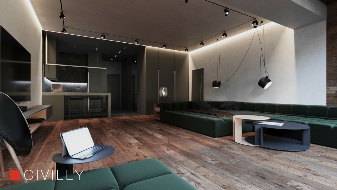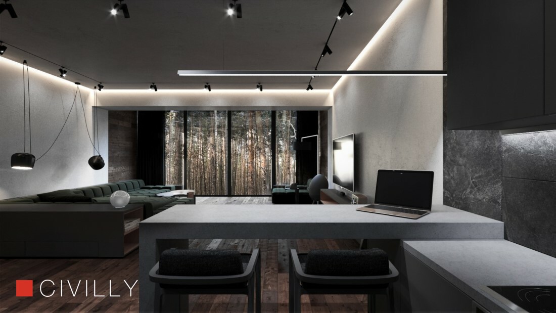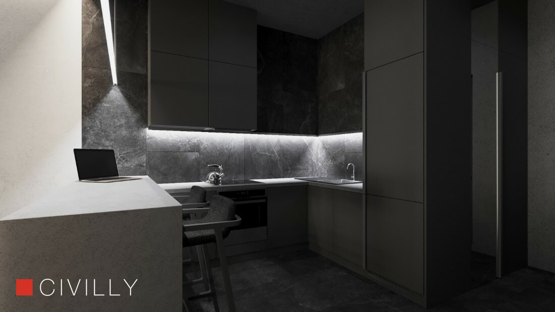 Пространство было визуально зонировано по природным структурам.Входная группа мебели имитирует каменные элементы, и как продолжение, кухня и санузел выполнены в одной цветовой гамме.
