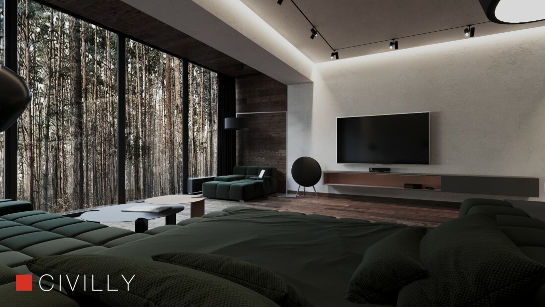 Учитывая местоположение объекта, а именно лес, дизайн помещения был разработан как продолжение леса с использованием материалов, максимально приближенных к природным фактурам и цветам.
