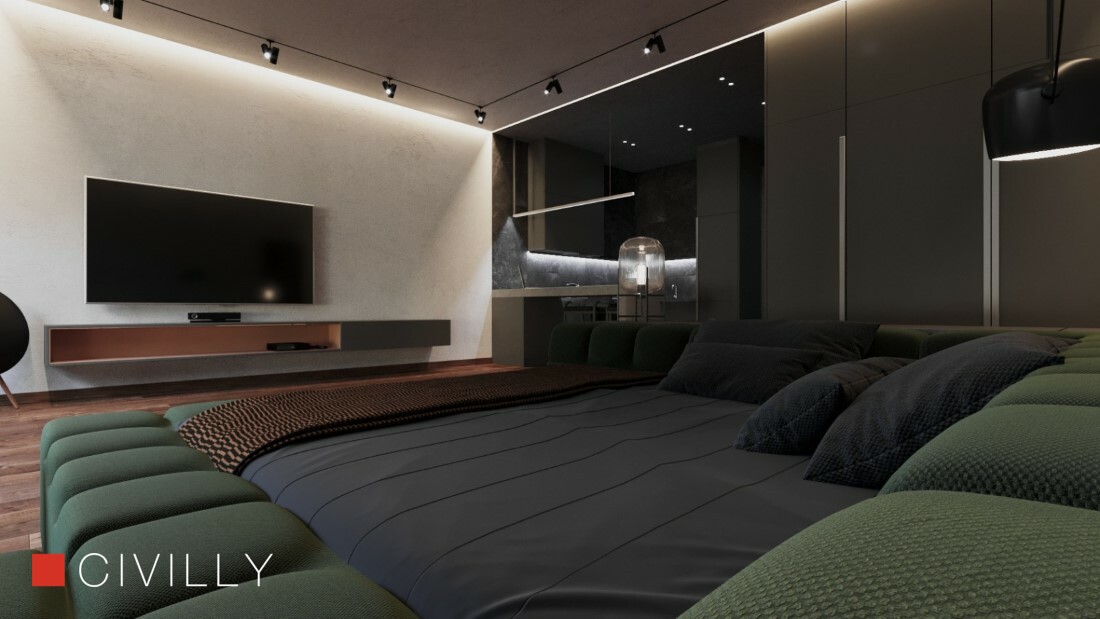 Благодаря панорамному остеклению, пространство наполнено природным светом, который мы старались максимально использовать, объединив спальную зону и зону отдыха.