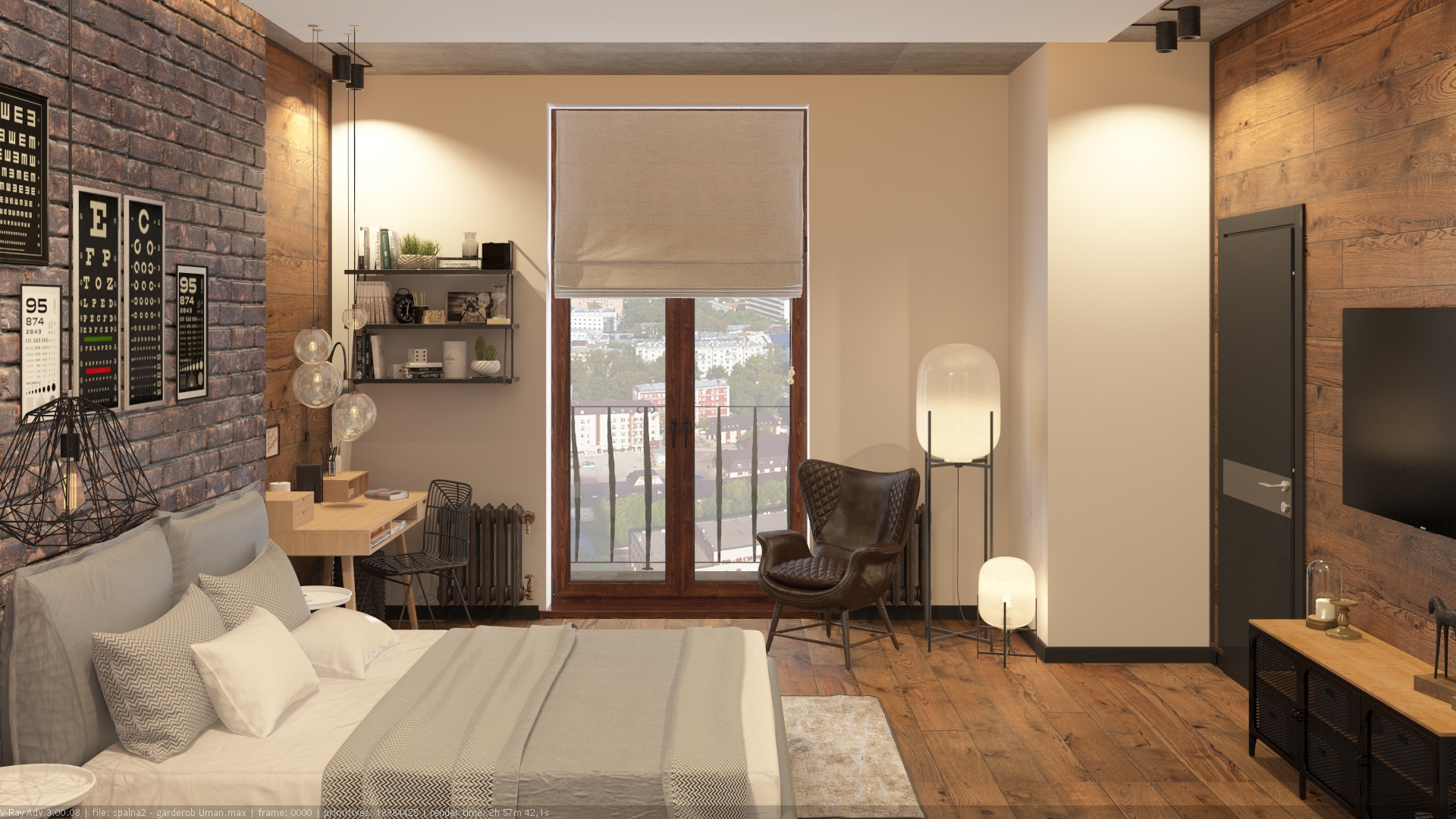 Благодаря наличию просторной гардеробной комнаты, взрослая спальня не загромождена мебелью, благодаря чему у наших дизайнеров была возможность поэкспериментировать с различными материалами отделки на стенах: декоративный кирпич и паркет смотрятся довольно брутально и контрастно, но при этом не противоречат, а наоборот, гармонично дополняют друг друга.