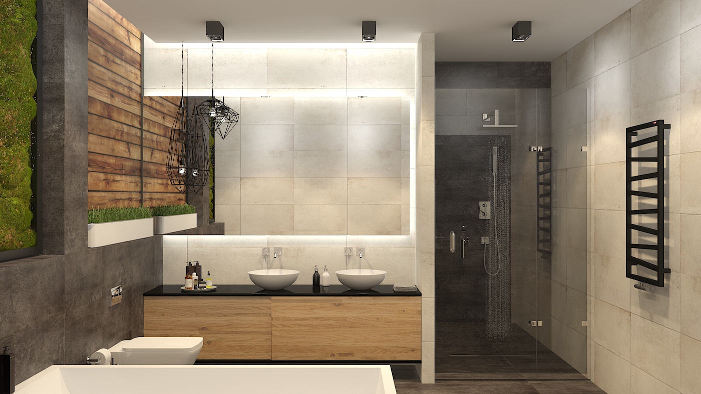 Гардеробная комната является проходной и ведет в мастер-санузел, оборудованный всем необходимым для комфорта родителей: ванной, душевой кабиной, двумя раковинами, унитазом и биде. Ванная комната облицована плиткой в приятных нейтральных песочных оттенках. Изюминкой ее интерьера стал деревянный фрагмент стены у зеркала и панно из стабилизированного мха, это дарит ощущение свежести и единения с природой даже в городских стенах. Еще один яркий дизайнерский элемент - авторские полотенцесушители, которые собраны из обыкновенных металлических водопроводных труб, в которые вмонтирован электрический тэн.