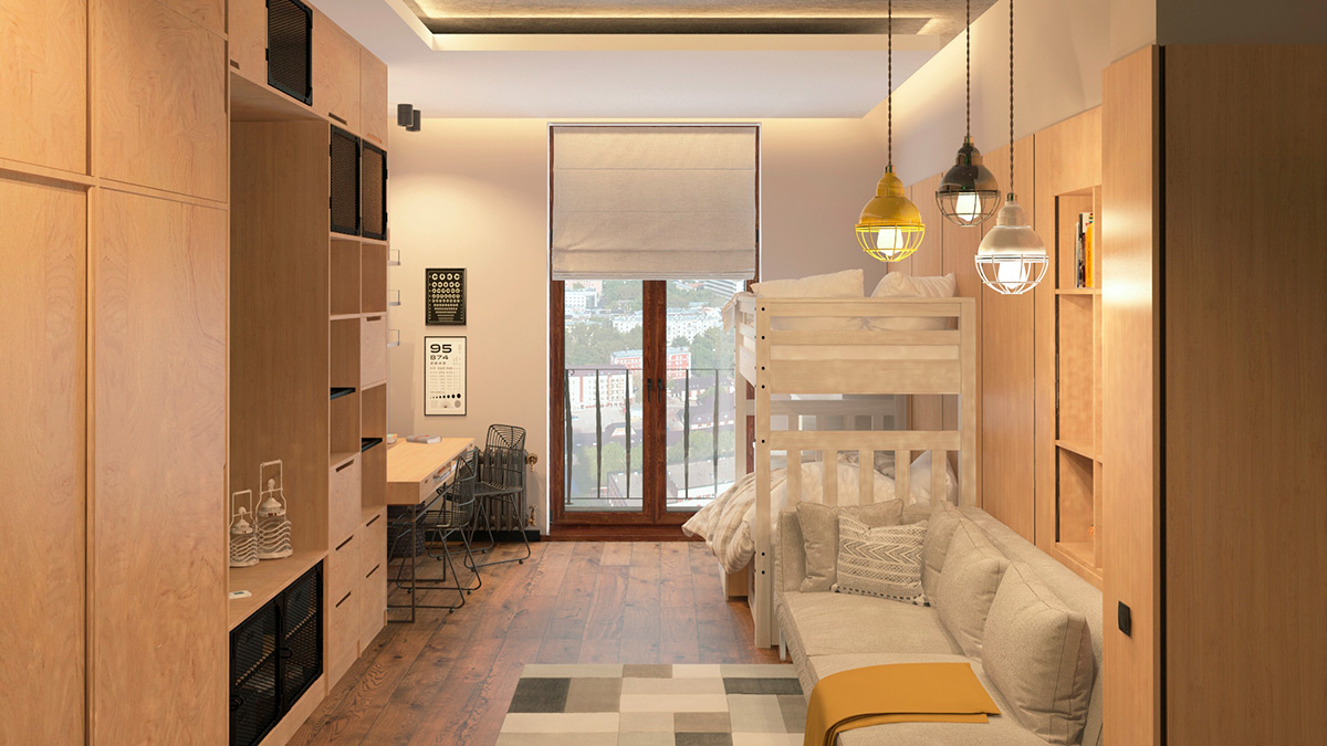 Детская спальня рассчитана на двух деток и грамотно зонирована на пространство для учебы и отдыха. За счет двухъярусной кровати и высоких шкафов для одежды и книг нашим архитекторам-дизайнерам удалось сэкономить драгоценное пространство в комнате и комфортно расположить в ней двух малышей, с расчетом на вырост. За широким столом смогут одновременно учиться два школьника, а диван напротив телевизора послужит не только местом для досуга, но и дополнительным спальным местом.