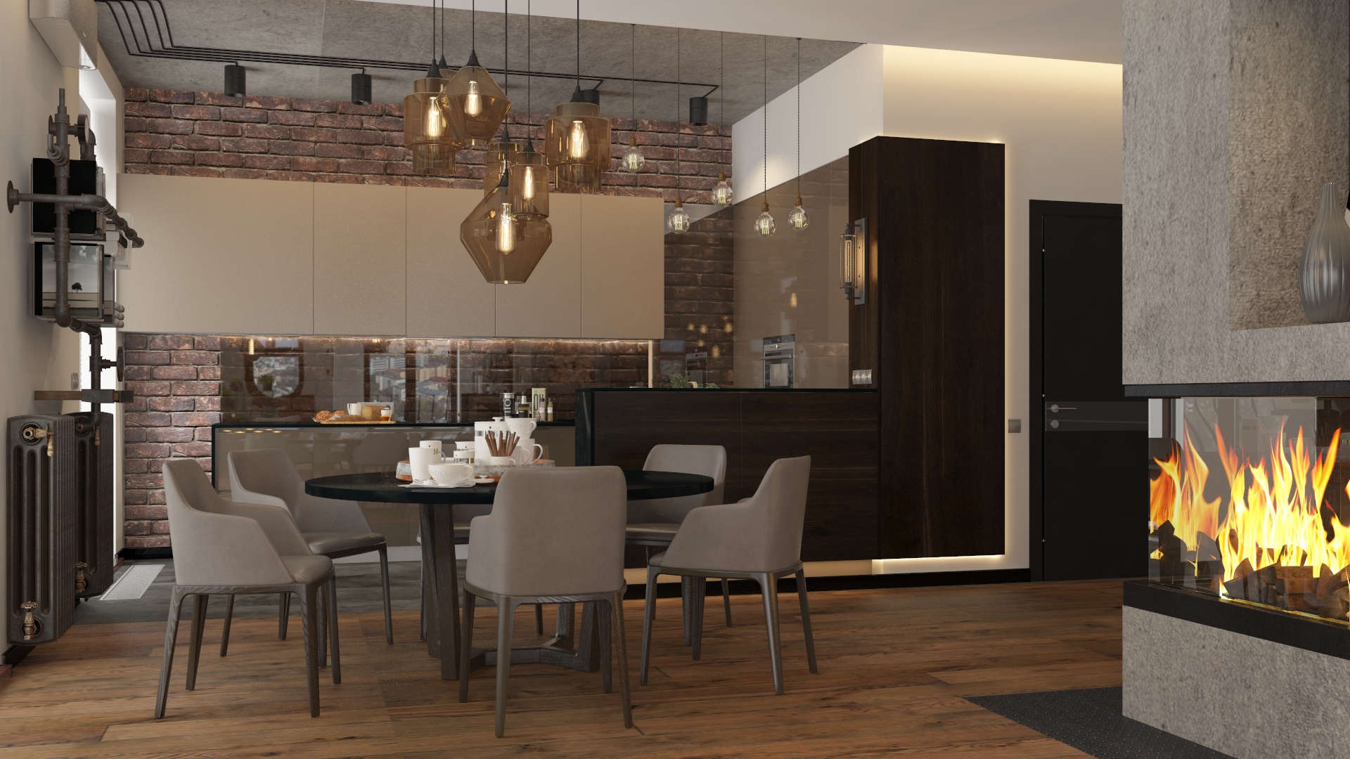 Обеденная зона, или столовая, зонально отделена от кухни с помощью небольшой барной стойки, а также другой цветовой гаммы и отделки. Главным акцентом кухни, как и полагается лофту, стала кирпичная стена вдоль всей рабочей поверхности. Для большей функциональности и практичности она закрыта стеклом, что значительно облегчает процесс уборки после приготовления любимых блюд и сглаживает контраст между глянцевым гарнитуром в мягких кофейных оттенках и грубым кирпичом.