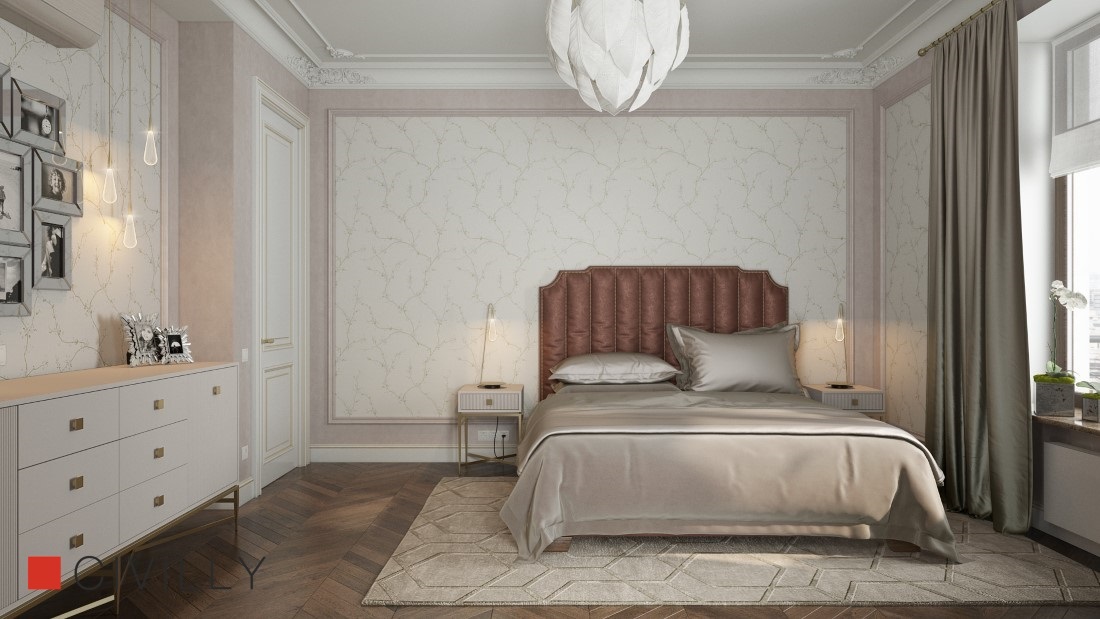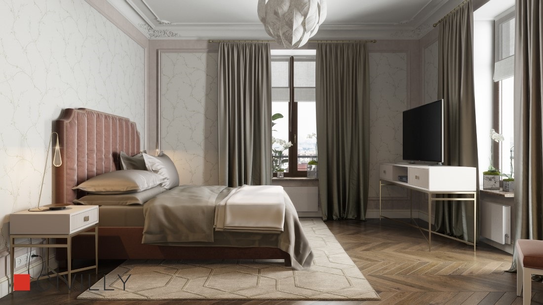 Большинство помещений выдержаны в светло-песочных и пепельно-розовых тонах. Спальня выполнена в общей цветовой гамме, в ней была запроектирована изысканная мебель в стиле ар-деко на изящных латунных ножках.
