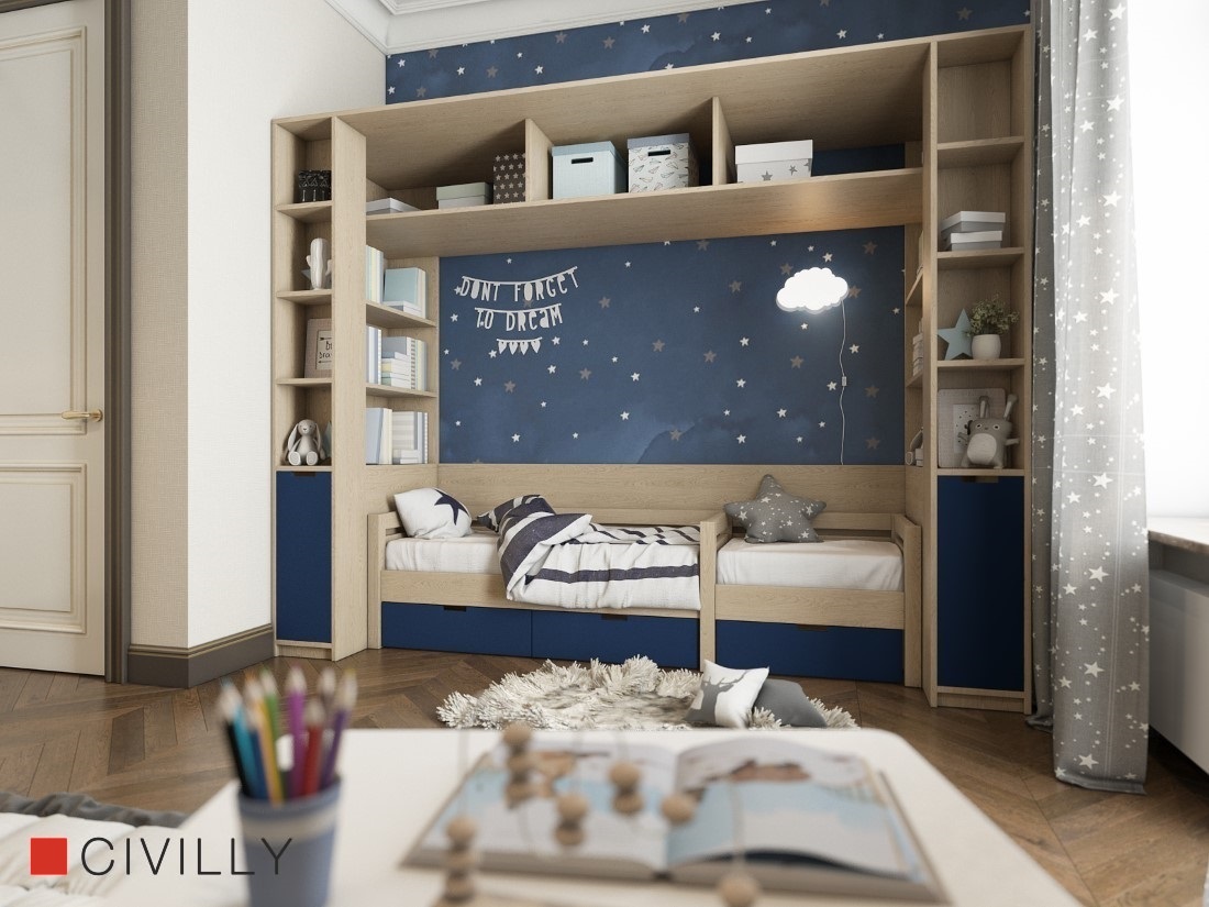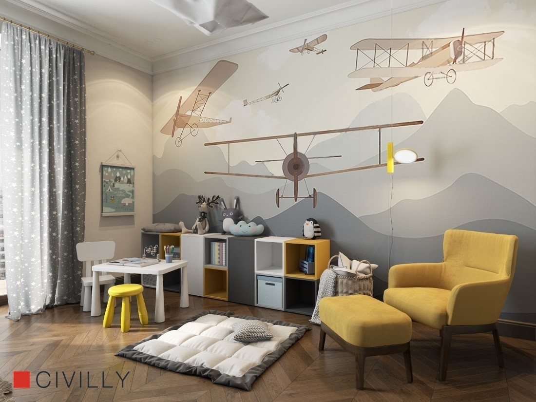 Детская комната достаточно отличается от общей стилистики квартиры, она была запроектирована свободным пространством с легкой трансформирующейся мебелью. Акцентом является стена с тематическими фотообоями.