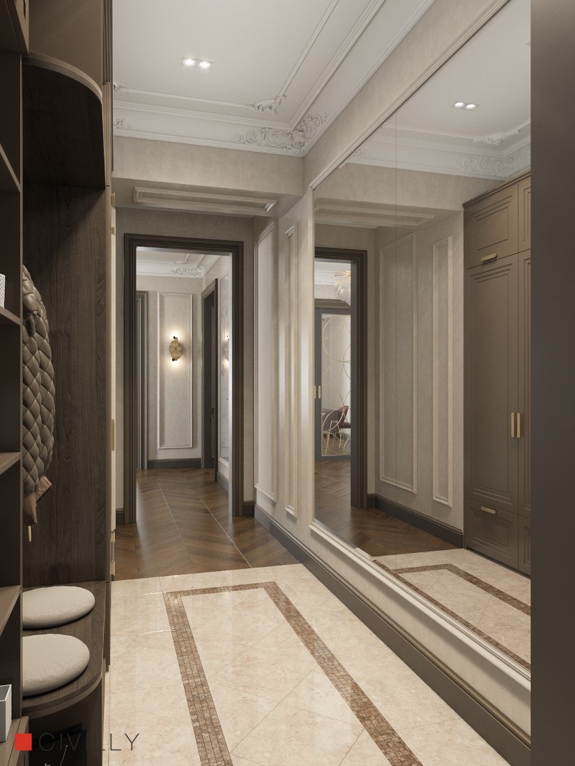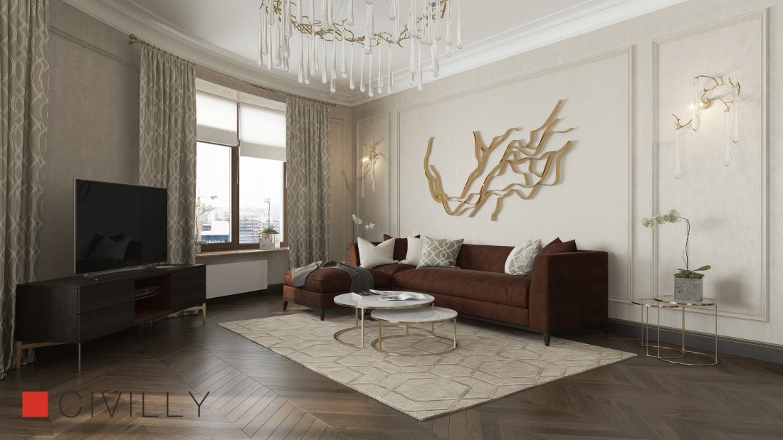 Стилистика данного интерьера эклектична: ее можно охарактеризовать, как неоклассику с элементами ар-деко и модернизма: классические, традиционные приемы оформления помещений сочетаются с современной мебелью, светильниками, аксессуарами и предметами декора.