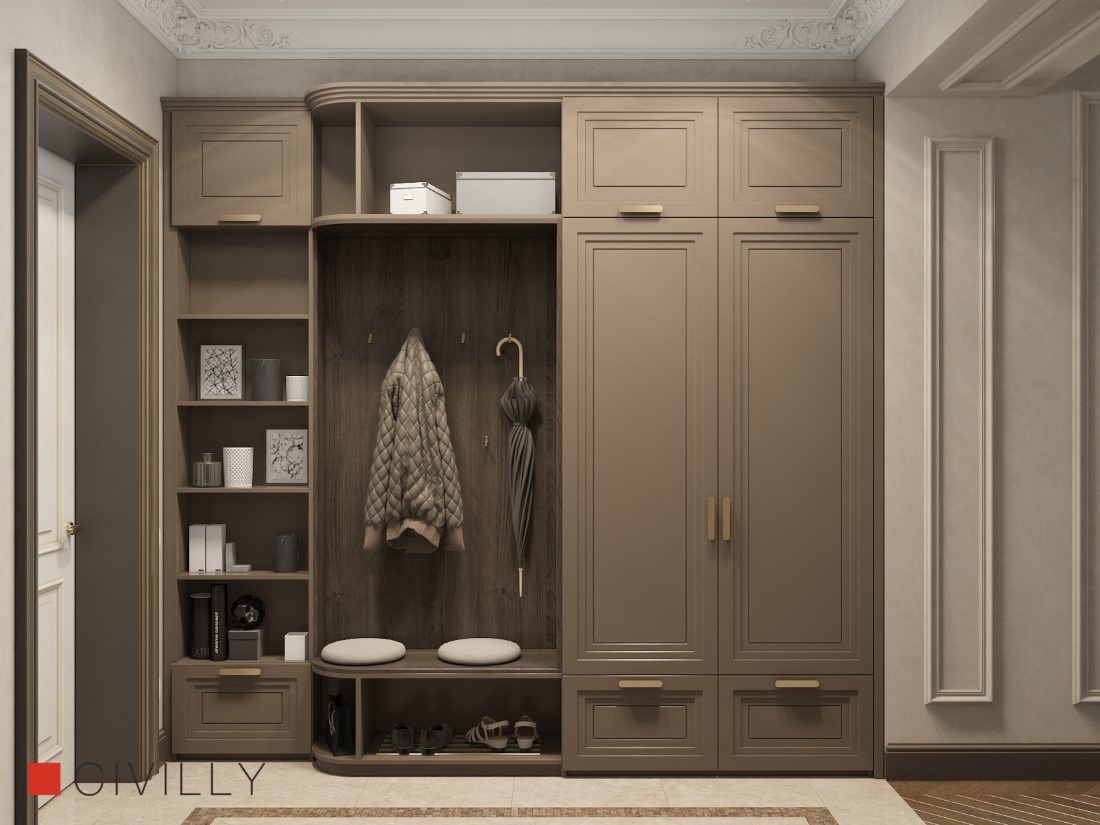В прихожей запроектирован вместительный удобный шкаф для верхней одежды, панель с крючками, место для обуви и стеллаж из полок, все это объединено в общую композицию. На противоположной стене установлено большое зеркало, что визуально увеличивает пространство относительно небольшой прихожей. Холл с одной стороны украшен мозаичным панно, с другой – травленными зеркалами.