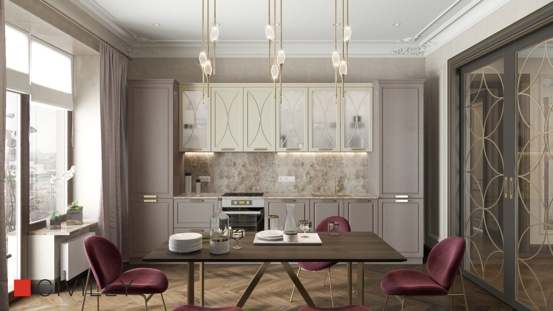 Кухню от гостиной отделяет большой портал с раздвижными дверьми. Нашей компанией были предложены и разработаны латунные полки с фоном из травленого зеркала с эффектом старины. В помещении кухни прослеживается рисунок полуокружности, который присутствует на раздвижных дверях и полках. Кухня выполнена в общей цветовой гамме с контрастной фиолетовой обивкой стульев. Столешница и кухонный фартук (рабочая стенка) выполнены из натурального мрамора.