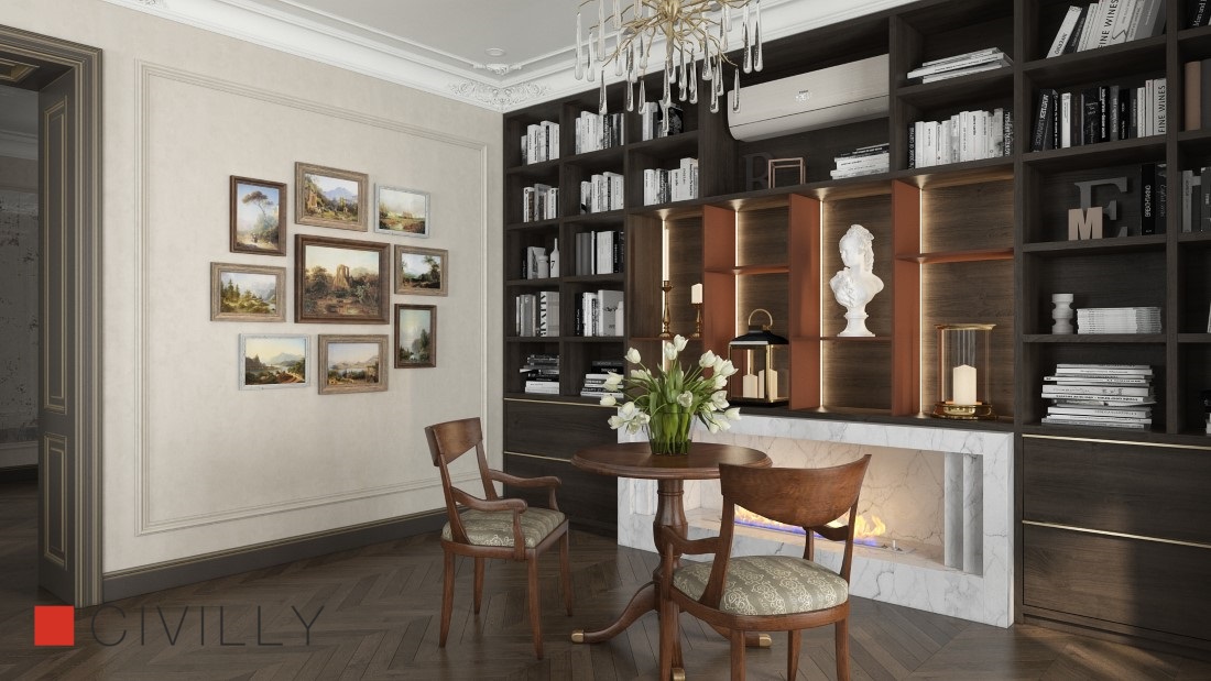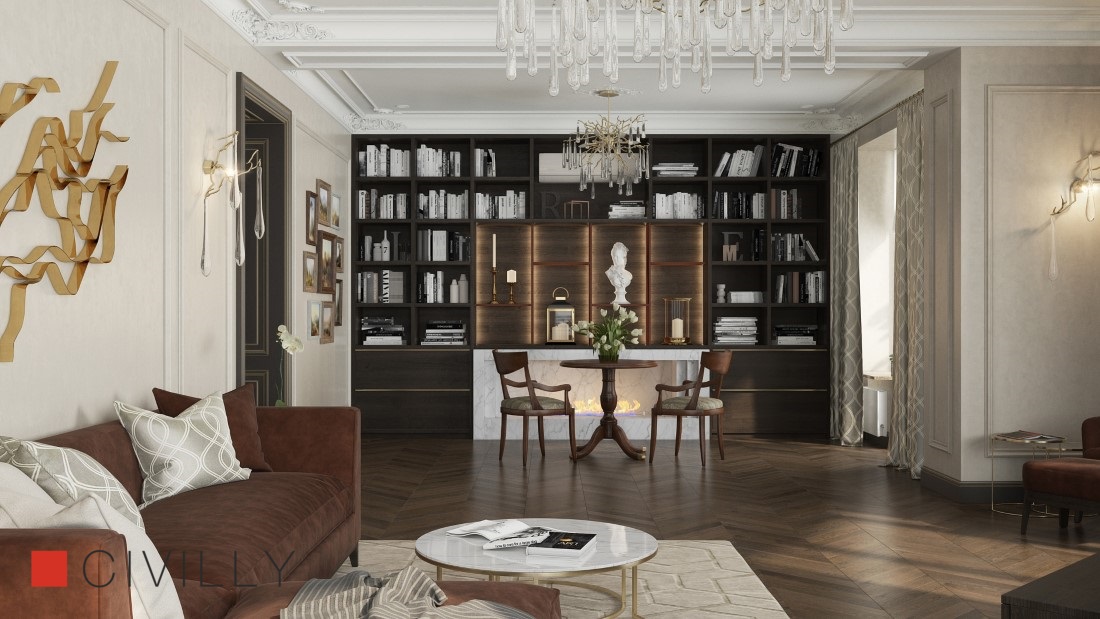 Перед созданием дизайн-проекта данной квартиры, мы изучили все интересы и предпочтения заказчиков. Хозяйка квартиры увлекается антиквариатом, собирает предметы искусства, а также владеет большим количеством книг. Для комфортного содержания этой коллекции, мы спроектировали в гостиной библиотеку с выделенными местами для экспозиции. Фасады библиотеки акцентируют на себе внимание при помощи встроенной подсветки. В центре экспозиции расположен био-камин в мраморном портале. В зоне возле библиотеки нашлось место для уже имеющейся у владельцев старинной мебели.