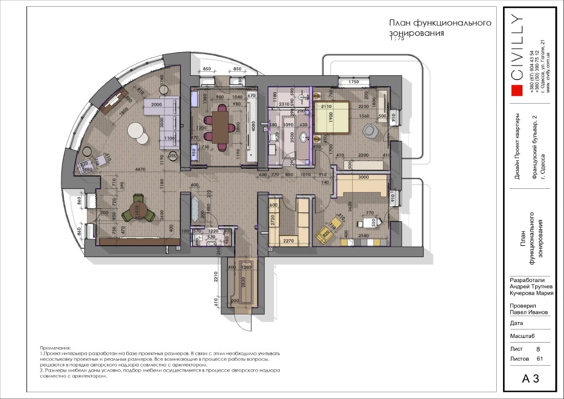 В данном проекте интерьера тесно переплетены современные решения с классическими элементами декора и отделки. В отделке стен и потолков мы использовали гипсовую лепнину (причем слепки были сняты с исторического здания, памятника архитектуры – таково было пожелание заказчиков), в отделке пола был использован паркет из натурального дуба, уложенный французской елкой. Все это воссоздает атмосферу старых одесских доходных домов, которые служили летним и зимним пристанищем для поэтов, музыкантов, купцов и академиков, искавших отдыха и вдохновения на южном побережье.