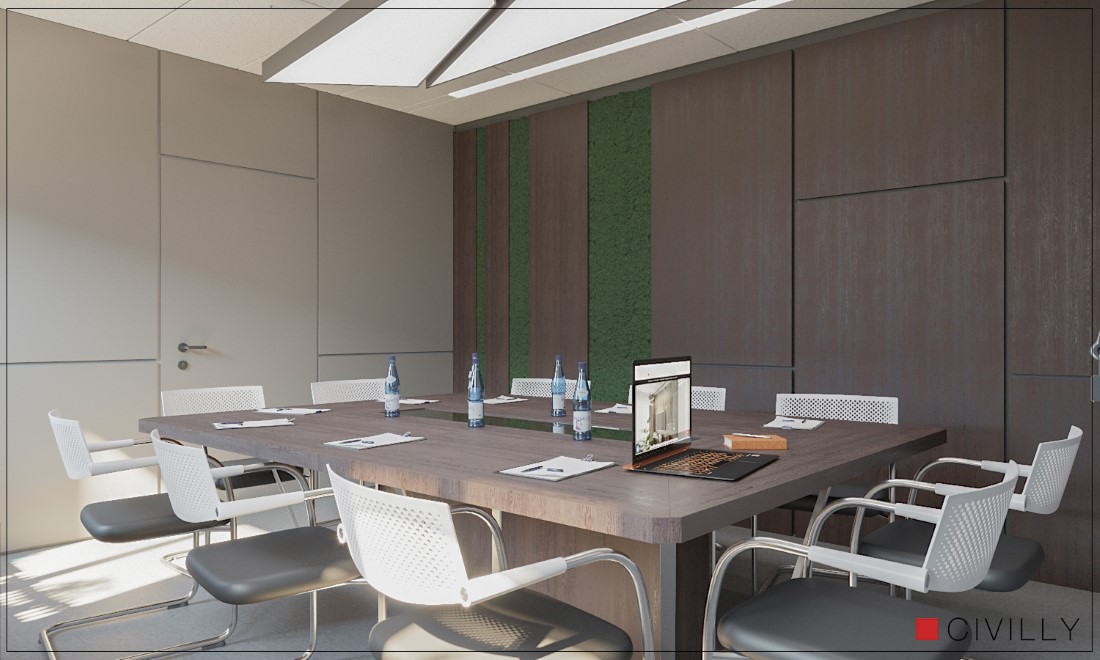 В конференц-зале применены авторские декоративные решетки, которыми закрыты радиаторы, конференц-стол сделан максимально большим, пропорционально размерам помещения. Декоративный стабилизированный мох на стеновых панелях и в центре стола предназначен для того, чтобы несколько разрядить временами суровую атмосферу переговоров.