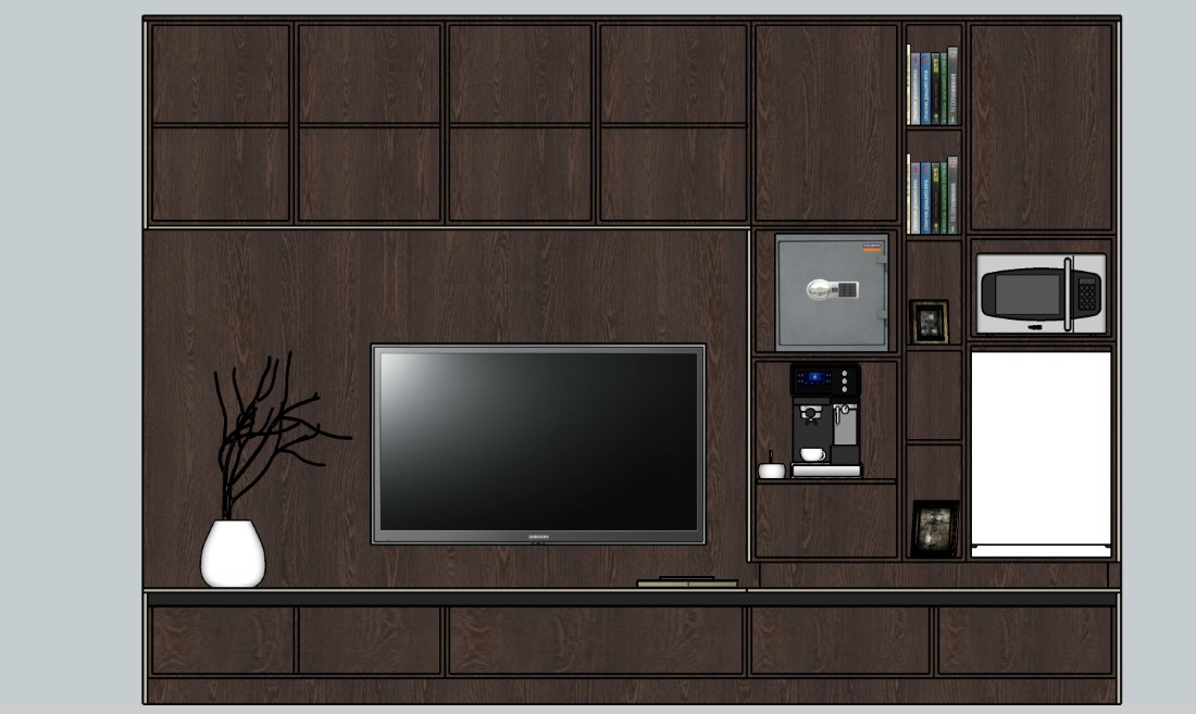Дизайн комнаты отдыха предельно функциональный. За фасадами шкафов скрыто множество необходимой техники, это кофе машина, сейф, холодильник.