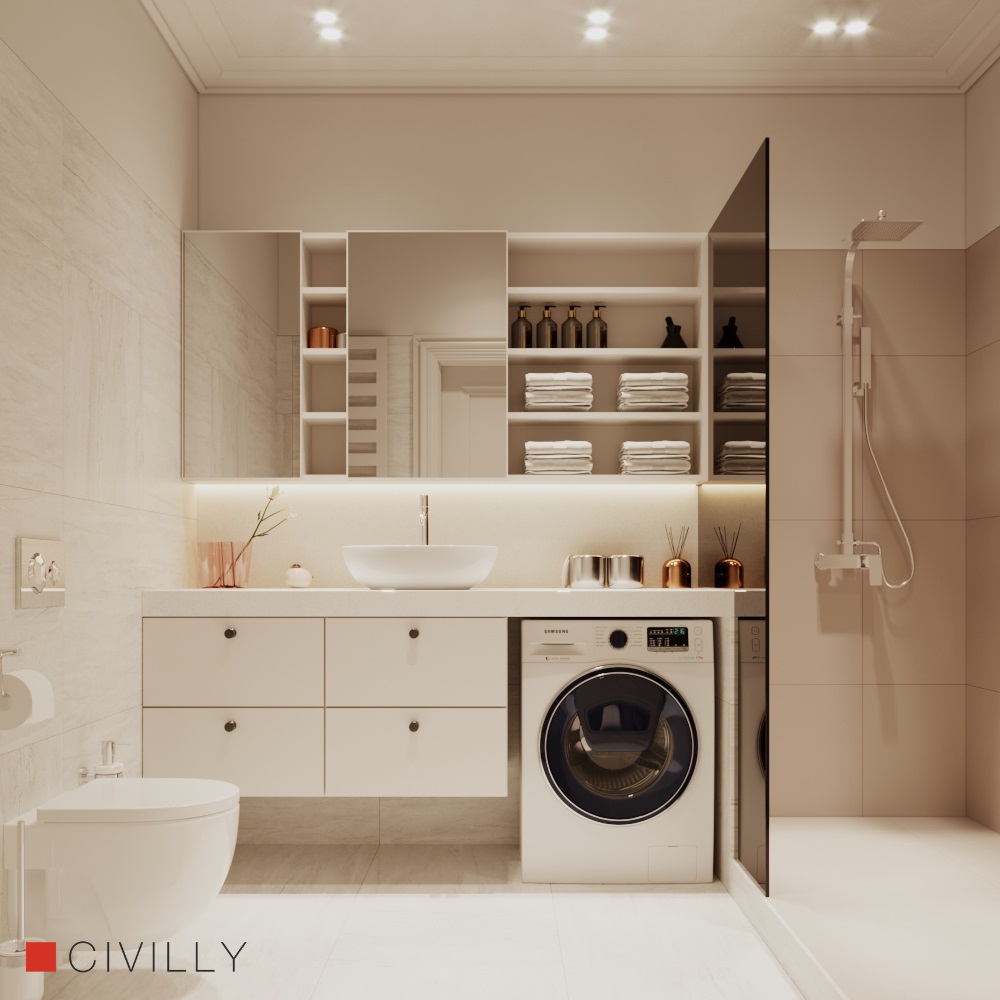 Справа по коридору находится вход в санузел, объединенный с постирочной. Грамотное решение подобрано и для стиральной машины: она расположена под столешницей, что существенно экономит пространство в ванной комнате. Бежевая плитка и мягкое освещение создают атмосферу уюта. Душевая кабина очень просторна, ее размеры позволяют выполнить остекление без двери, что упрощает стоимость конструкции, а также делает пространство максимально открытым.
