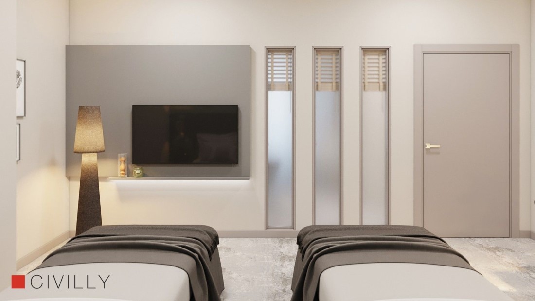 SPA-зона и фитнес-комплекс. В дизайн-проекте SPA-зоны Civilly реализовала решения, объединяющие спорт, отдых и восстановление. Здесь предусмотрены бассейны, хамамы, симуляторы тенниса и гольфа, тренажёрный зал и комфортные раздевалки с антивандальной мебелью. Все зоны выдержаны в едином современном стиле и полностью соответствуют требованиям премиального отеля.