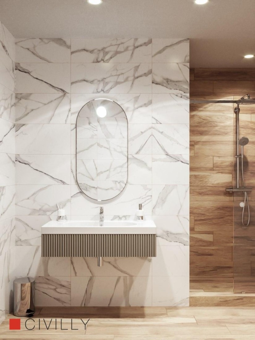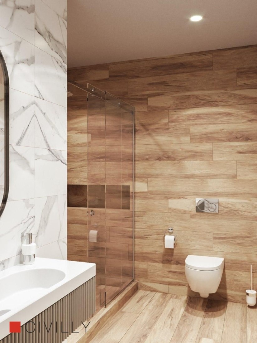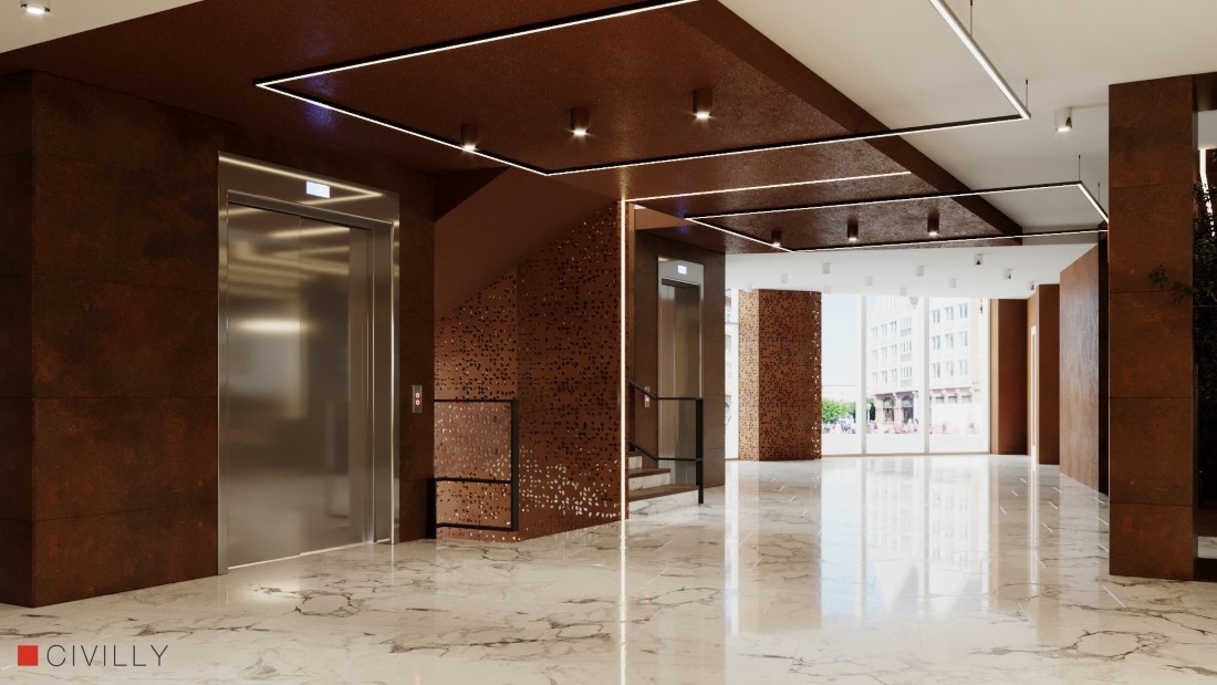 В отделке использованы перфорированные металлические листы с тематическим рисунком, мрамор и деревянные панели — всё это формирует утончённый современный стиль.