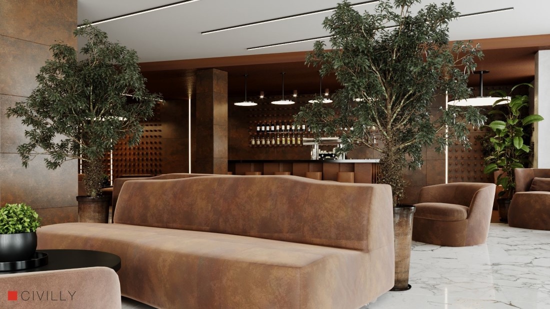 Холл и общественные зоны. Интерьеры холла выполнены в бело-коричневых тонах с элементами металла и скрытой подсветкой. Лобби-бар и зоны отдыха оформлены в шоколадных оттенках, создающих уютную атмосферу.