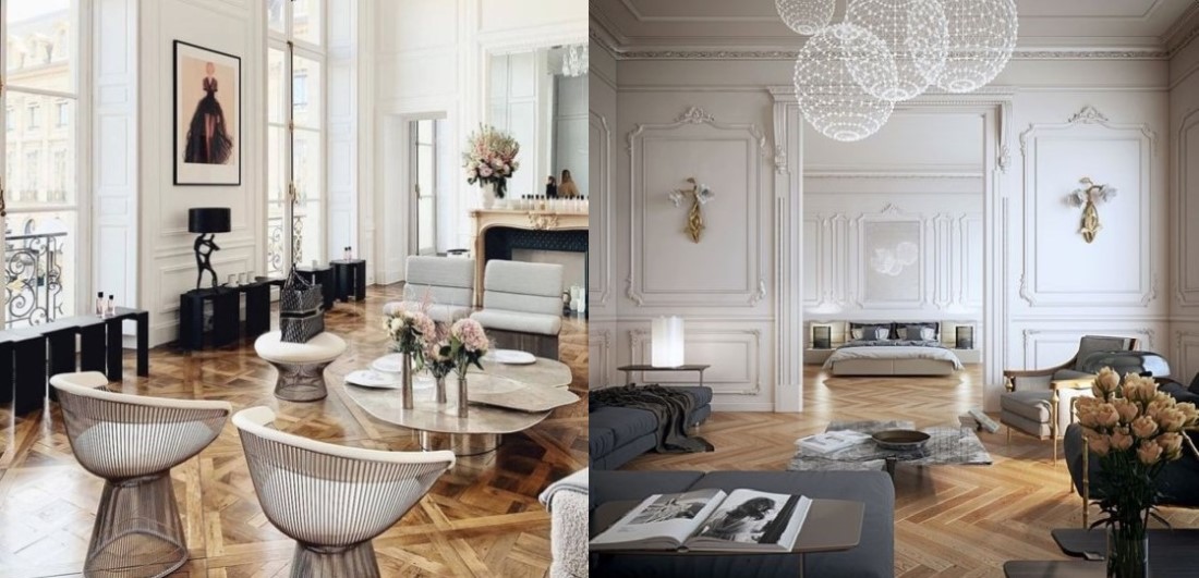 Варианты полов, которые можно использовать в стиле неоклассика бесконечно, но характерными чертами являются деревянный паркет с ровным, герметичным узором, покрытый небольшим современным ковром с размытым или фактурным орнаментом.
