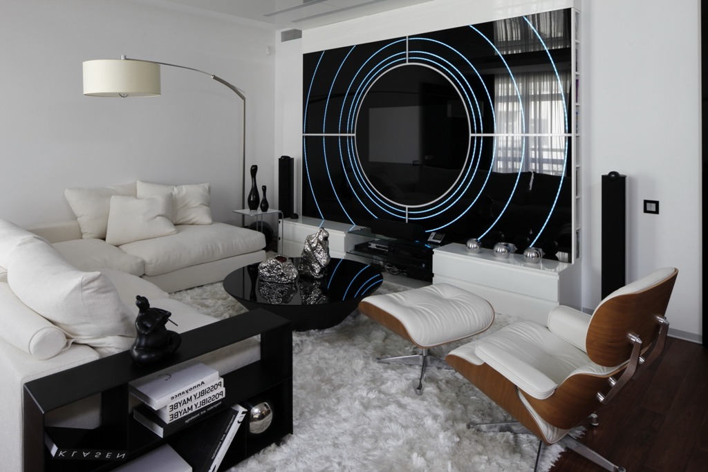 Хай-тек является стилем аксессуаров, и его легко реализовать в помещении с белыми стенами и потолком, а также полом, покрытым светлым ламинатом или плиткой. Основная задача — дополнить интерьер современной техникой, оригинальным освещением, зеркалами, стеклом, пластиком. В таком случае стиль высоких технологий раскроется во всём своём великолепии.