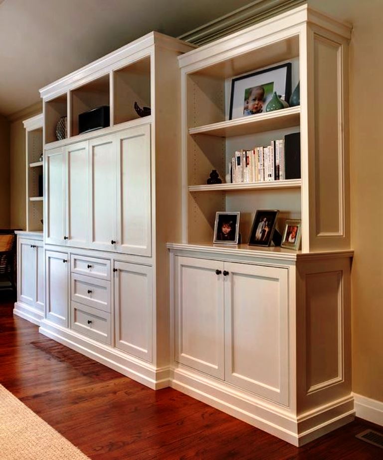 Этот вариант организации домашней библиотеки подходит и для апартаментов достаточно скромных габаритов, примечателен тем, что может быть сооружен кустарным способом или на заказ по индивидуальным размерам. Таким образом, стена, отведенная под библиотеку, полностью закрывается сеткой полок, которые в финальной версии получают обрамление из массивной рамы минималистичной или нео-классической стилистики.