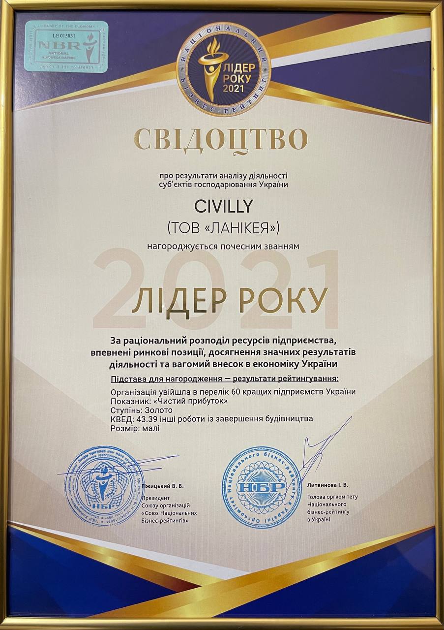 Компания Civilly стала лауреатом Национального бизнес рейтинга и получила почетное звание «Лидер года». Награду учредителям компании передали представители оргкомитета НБР в Украине.