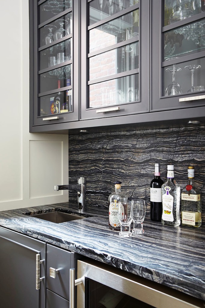 Мрамор с явными прожилками идеально смотритсся в чёрно-белой кухне. Подобное сочетание притягивает и восхищает, от него сложно оторвать взгляд.