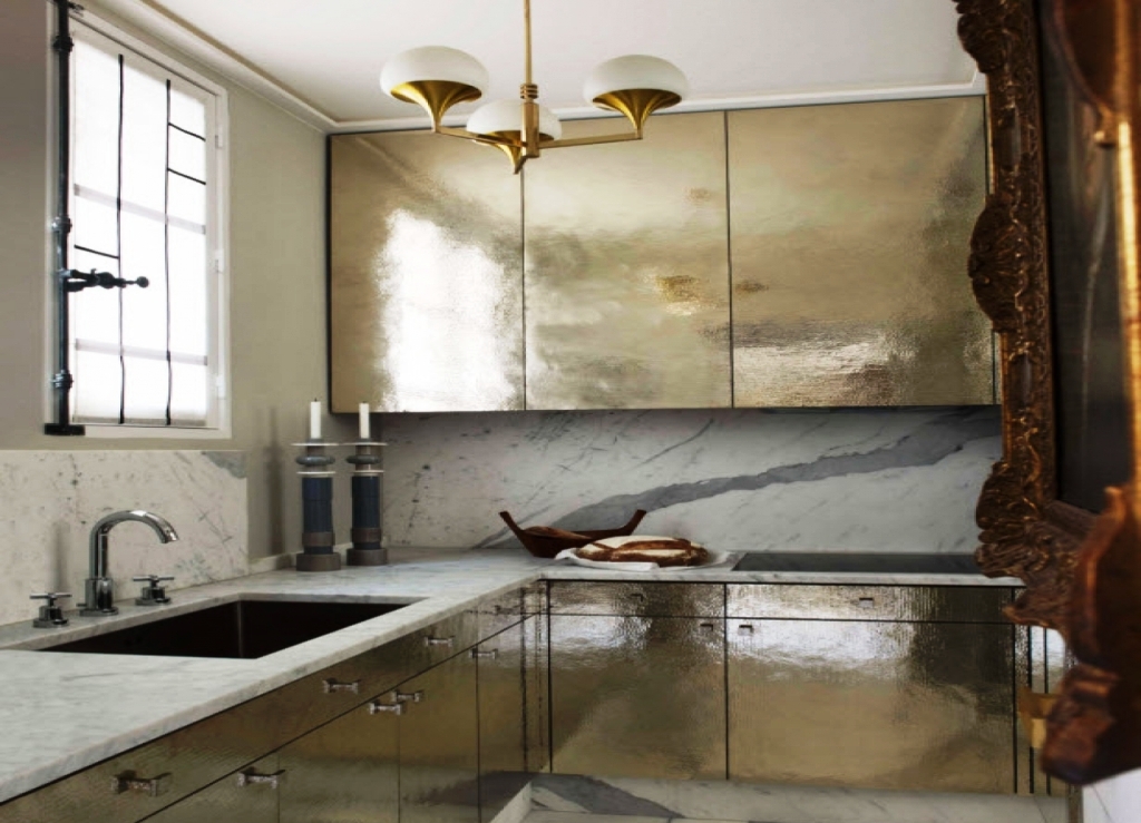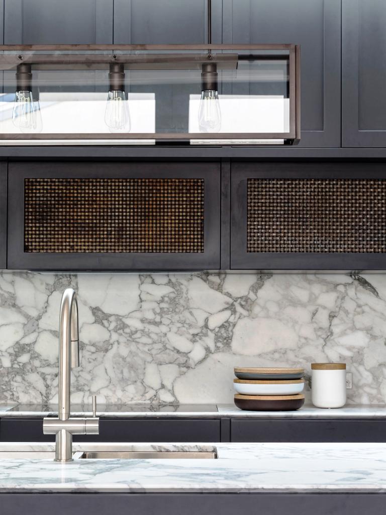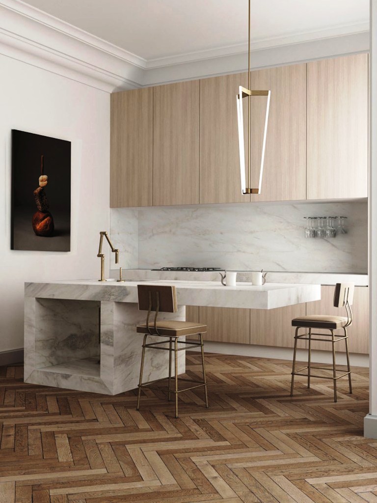 Ярким дополнением к медным светильникам и древесным оттенкам кухни станет мрамор с абстрактным узором. Любой металл отлично сочетается с мрамором, главное — выбрать подходящий оттенок.