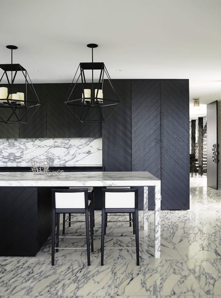 Потрясающий контраст мы получим в сочетании белого мрамора с чёрными фасадами.