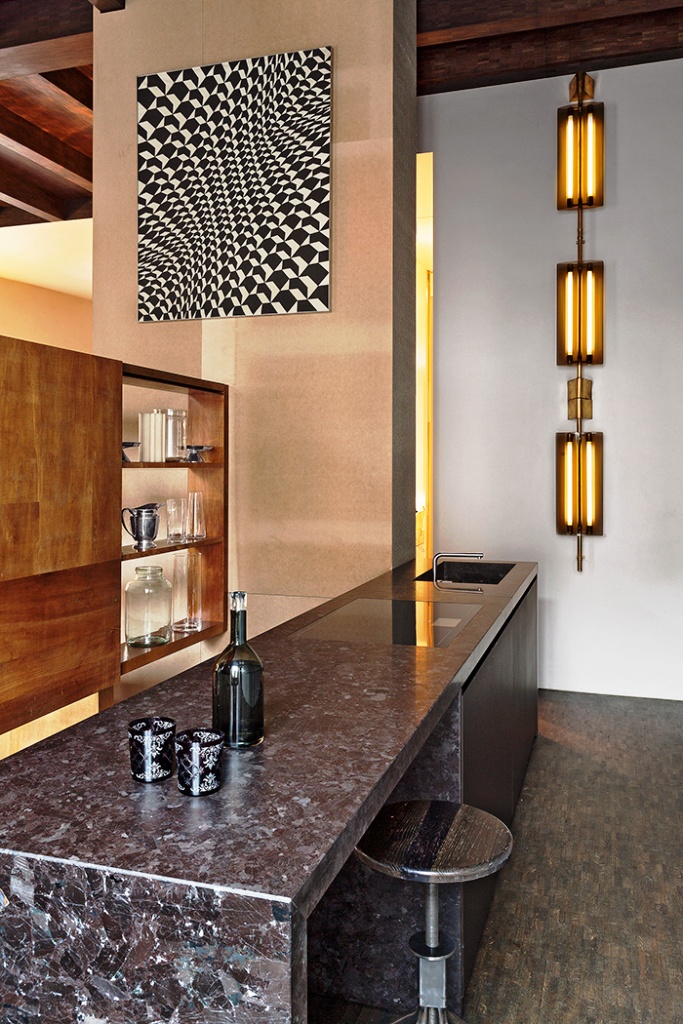 Безмятежное настроение для неторопливых завтраков создаст столешница в цвет фасада и кухонного острова.