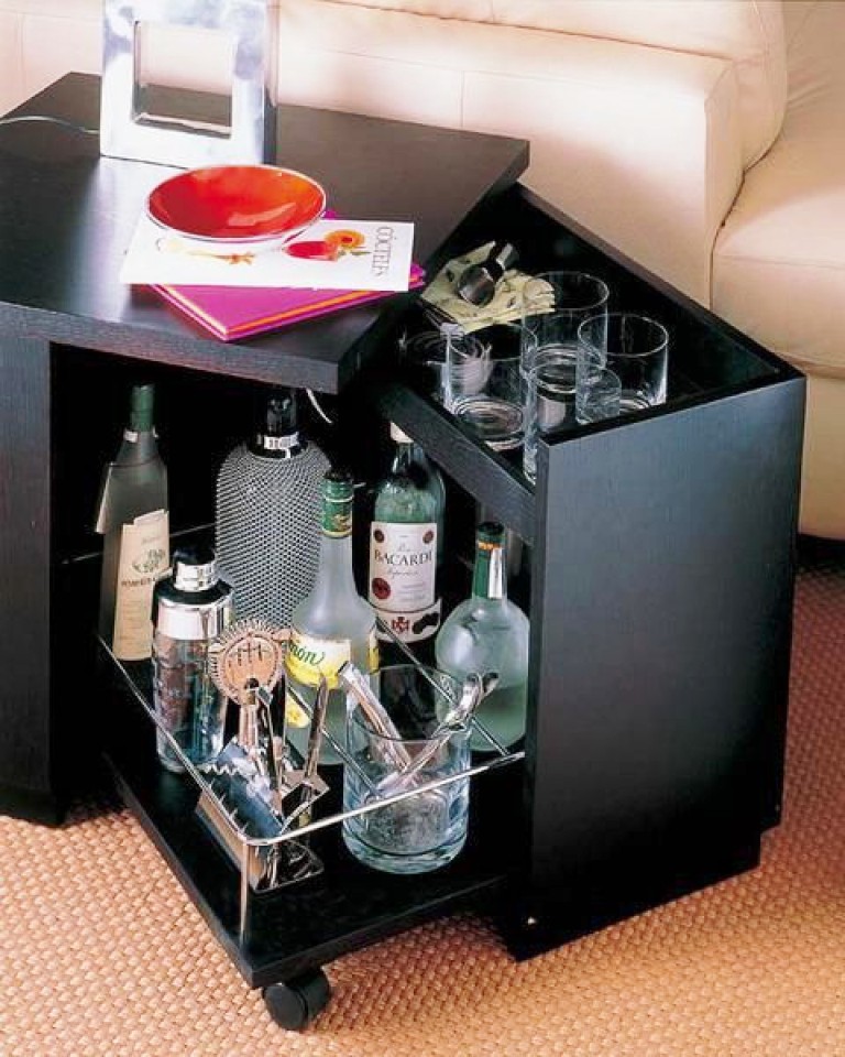 Если Вы — владелец небольшой квартиры или дома, то лучше приобрести бар передвижной. Изначально они появились в те времена, когда появилась культура потребления алкоголя. Мебель оснащалась столешницей, и некоторые мобильные мини-бары для дома были похожи на шкаф. А называли их кабачком или полушкафом.