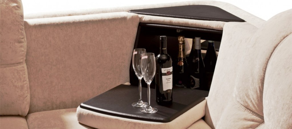 У одних моделей диванов мини-бар выезжает из спинки, у других — скрывается в подлокотнике, а еще у некоторых — замаскирован, и открыть его можно только при нажатии соответствующей кнопки пульта.